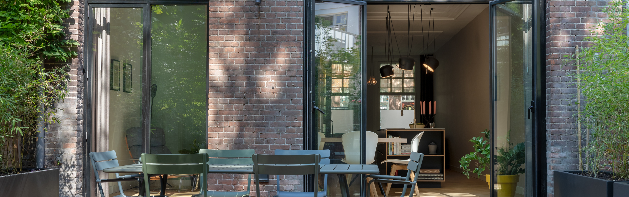 De oude achterpui is vervangen door Metaglas Classic met naar buiten draaiende ramen en een geïsoleerd aluminium kozijn. Door draaiende ramen, deuren en vaste elementen modulair te combineren ontstaat een harmonieus gevelbeeld. De slanke aluminium roeden geven het systeem een subtiele steel look die aansluit bij de authentieke architectuur.