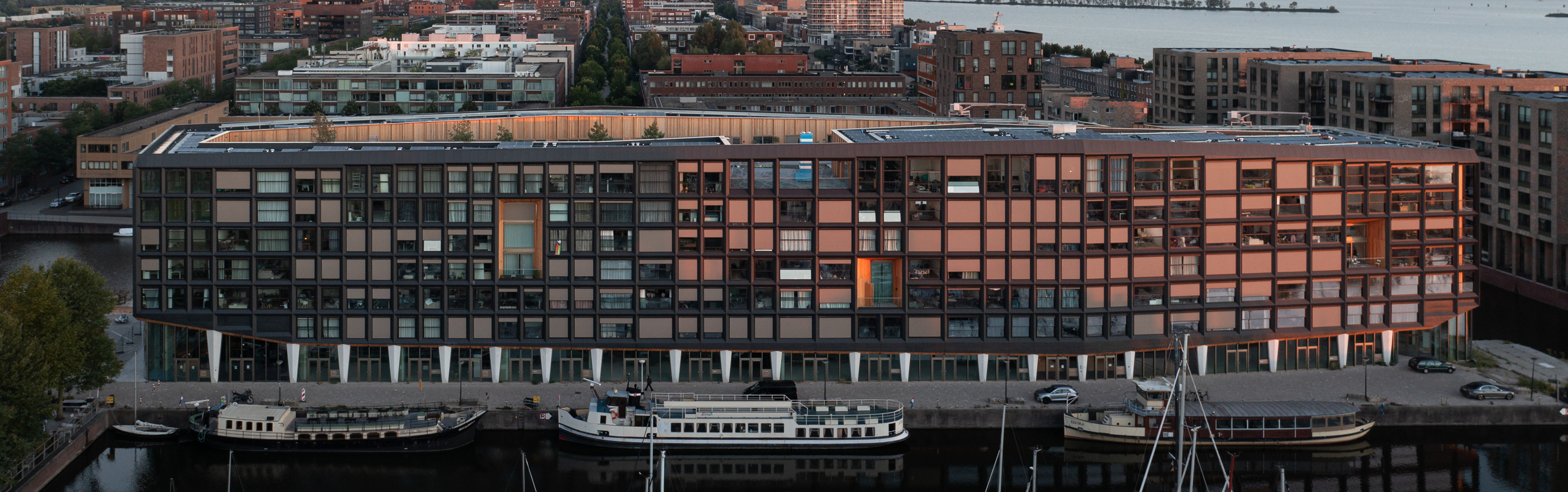 De minimalistische profilering en de grote glasvlakken versterken het open karakter van het gebouw. Vanuit de woningen ontstaat een panoramisch uitzicht over de haven van IJburg, het IJmeer en de omliggende stedelijke ruimte.