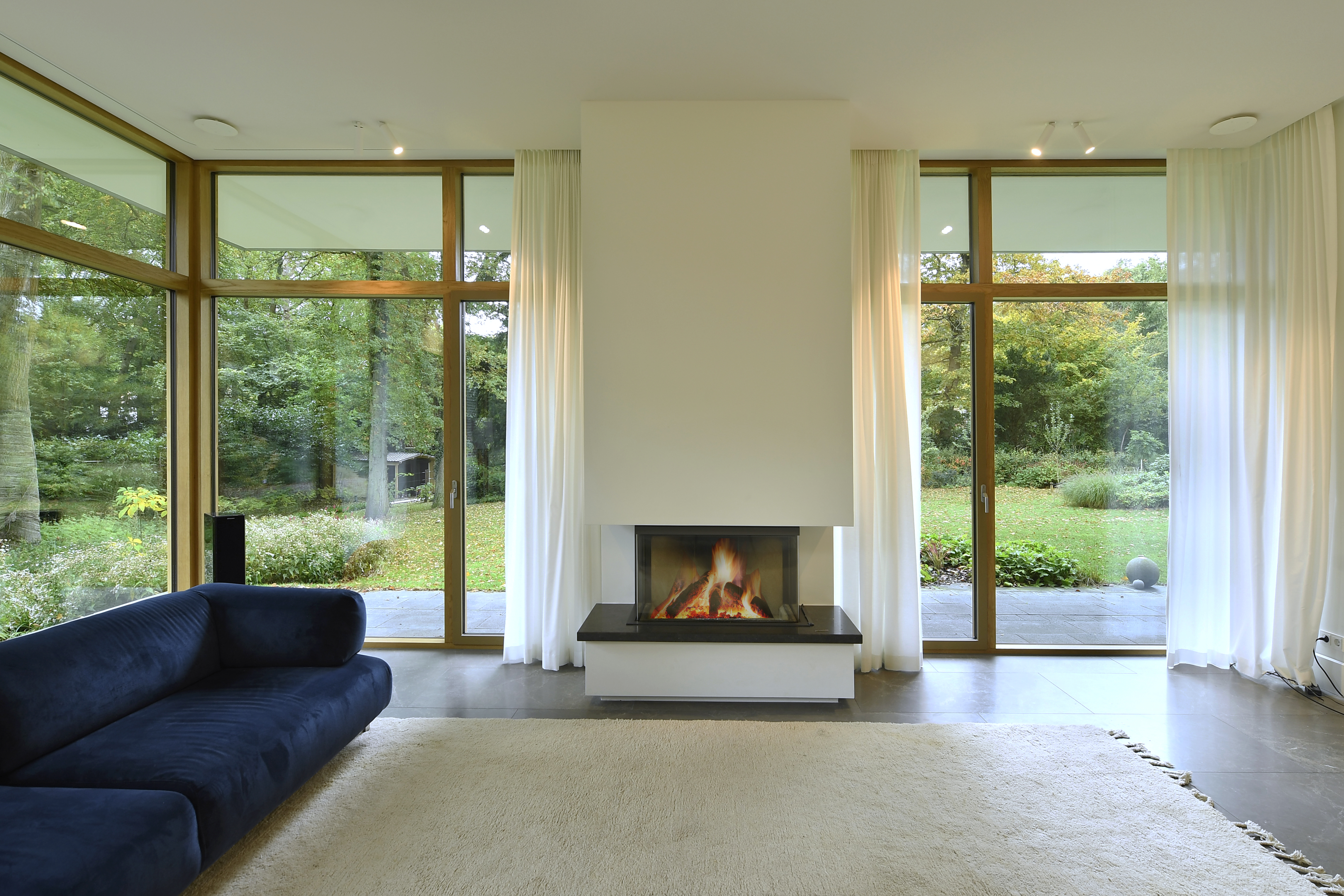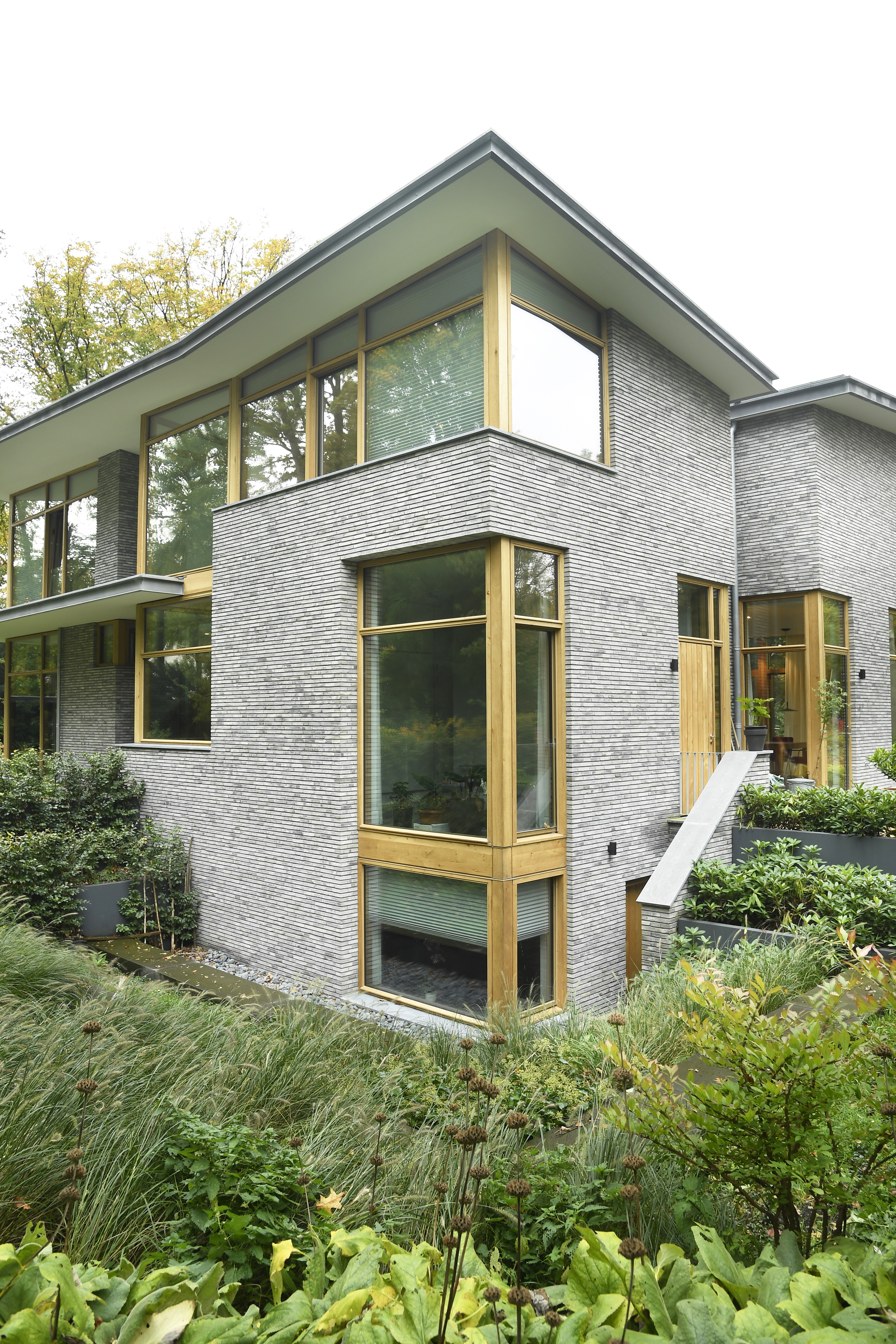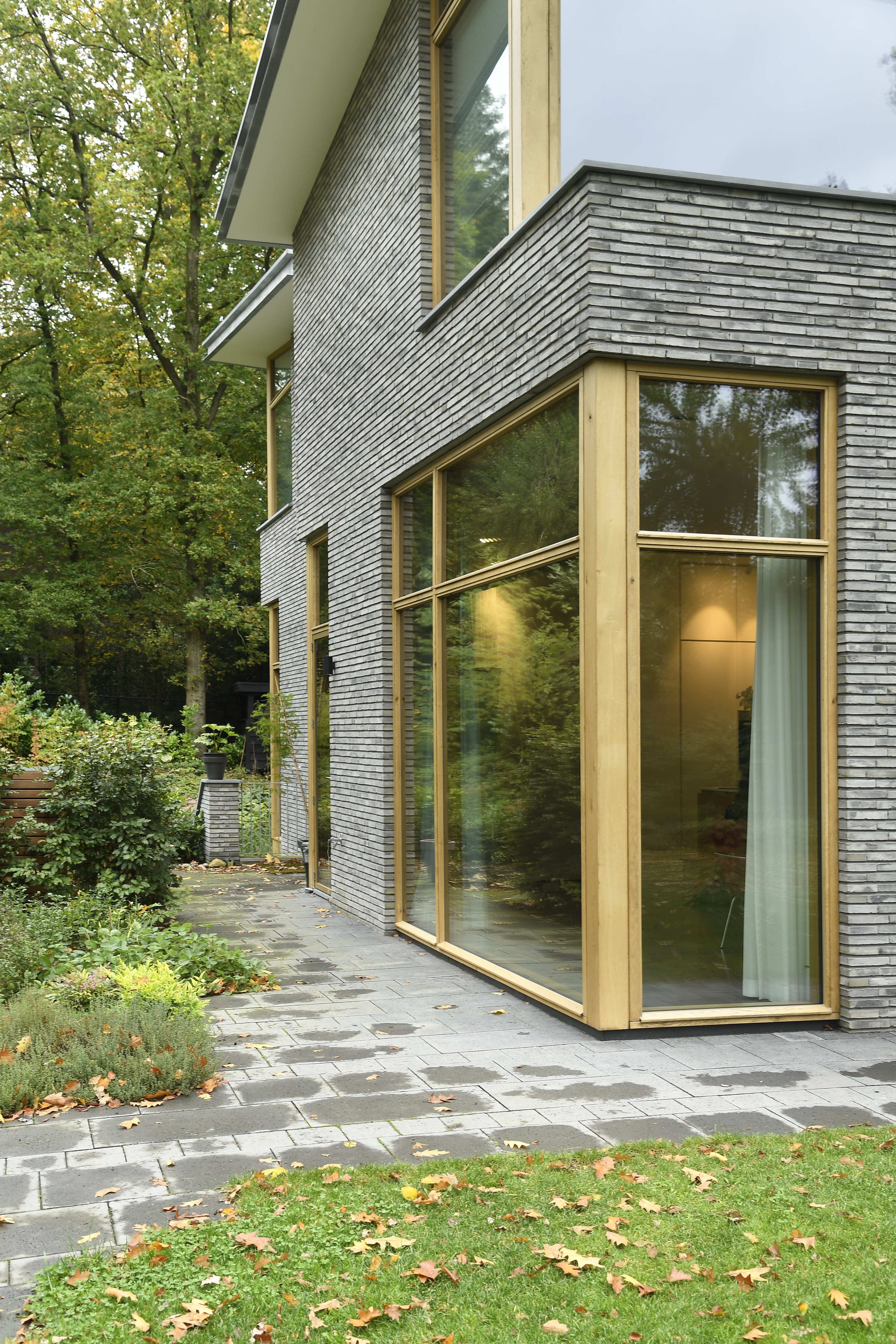 In de opdrachtgever vond Engel een sparringpartner. “Ook zij hebben een voorliefde voor detaillering. Samen hebben we jaren gebrainstormd. Daardoor zijn bijvoorbeeld de overstekken niet kloek, maar werden de dakranden veel verfijnder.” De houten kozijnen – die de gevel ‘verzachten’ zijn een handreiking zijn naar de omgeving. Ook hier is de liefde voor details waarneembaar. Zoals de profielen die de vorm van het dak volgen. En de Methermo Original draai-kiepramen die bijna onzichtbaar verwerkt zijn in de grote raampartijen. “Bij voorkeur gebruiken we de aluminium profielen van Metaglas, zeker in combinatie met houten kozijnen. We willen namelijk niet dat de aluminium kozijnen op de voorgrond treden. Door het aluminium zo te detailleren dat het wegvalt in het kozijn, lees je eerst het hout. Mede omdat we kozen voor een speciale houttint met matte structuur die net iets donkerder is dan de eikenhouten kozijnen.”