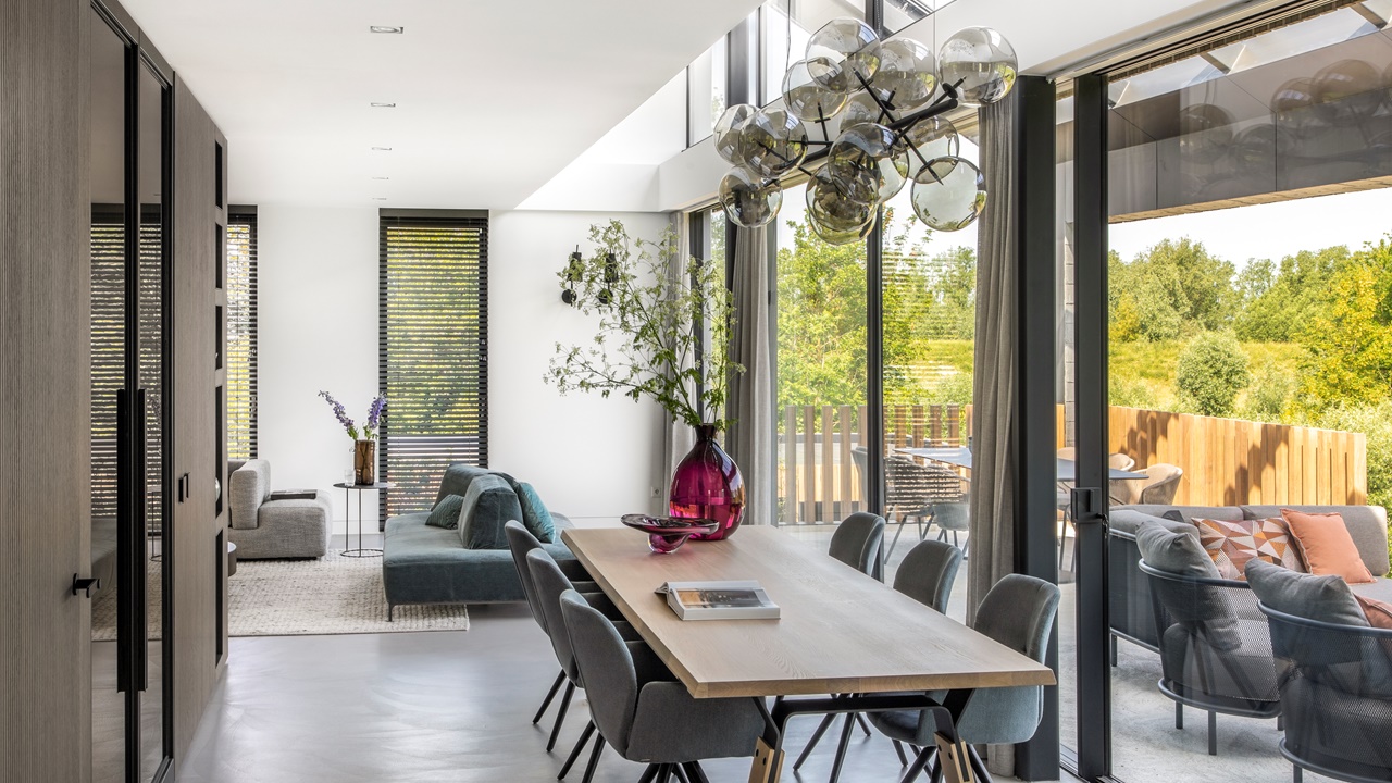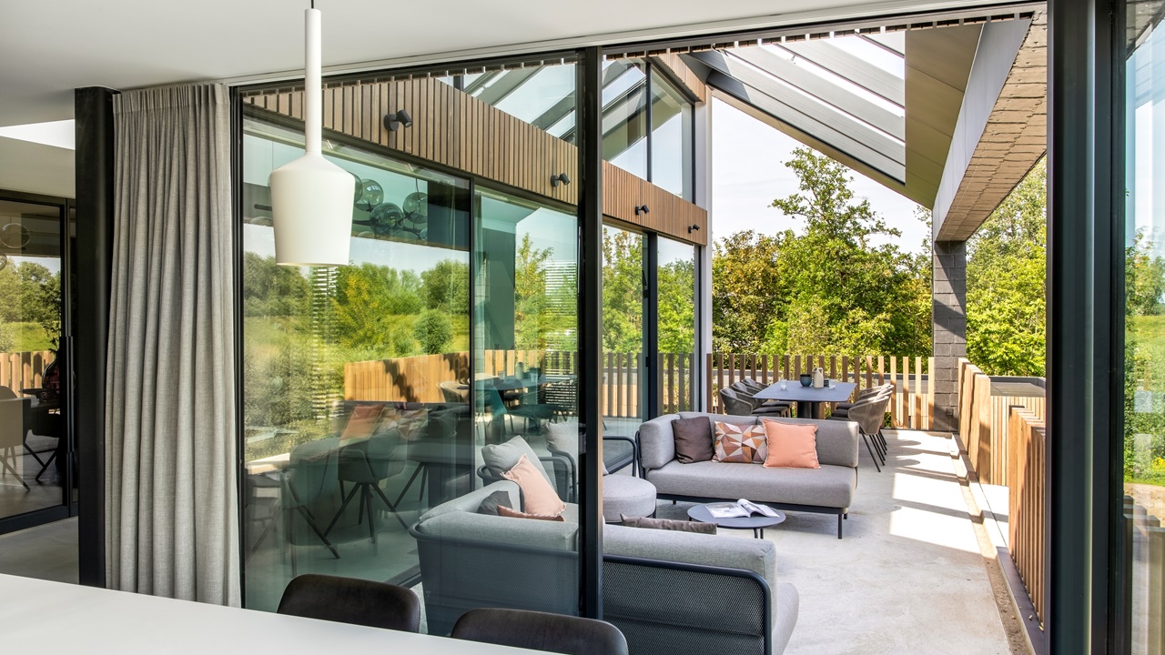 Door de ‘historische’ bakstenen aan de zijkant te combineren met stucwerk en aluminium kozijnen ontstaat een contrast tussen strak en ruw. Maar ook de diepe neggen in de voorgevel verlevendigen de façade. Dat wordt extra geaccentueerd door de slankheid van de Metaglas-profielen.” Terwijl aan achterzijde - waar de bewoners vanuit huis kunnen genieten van een panorama - de raampartijen de lijn van de gevel volgen. “Om het uitzicht te maximaliseren zijn de boven- en onderdorpels helemaal weggewerkt, verzonken in vloer en plafond.” Daarnaast zie je geen horizontale profielen en dragen de MethermoXL schuifpuien eraan bij dat de tuin onderdeel wordt van het interieur. Zelfs de bediening van de schuifdeuren is optisch bijna weggewerkt. Slechts een minimale stijl op het verticale profiel verraadt waar de deur bediend wordt.