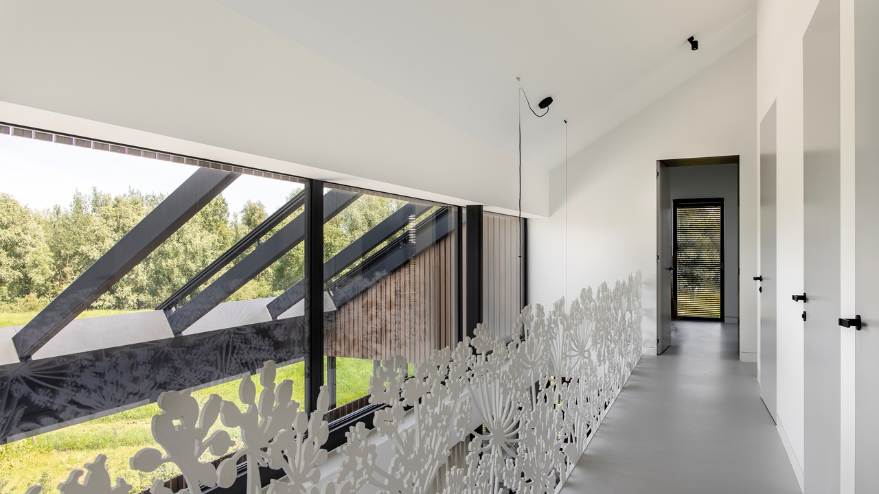 Meer in het oog springend is de begrenzing van de vide die de architecten voor de woning ontwierpen. “De balustrade doorbreekt de symmetrie. Net als in het tuinhek zijn in de balustrade patronen van bloemen, zoals fluitenkruid, verwerkt die in rivierlandschappen en bermen voorkomen.” Een functioneel kunstwerk, waarin de hele visie van Kap+Berk lijkt samen te smelten. Herkenning, de verbinding tussen de mens en de natuur, de wijze waarop met subtiele contrasten een heel eigen beleving ontstaat en de relatie die de woning aangaat met haar bewoners.
