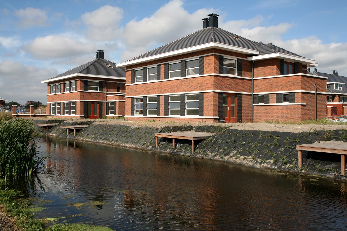 De Dromerdijk-afgeleide heeft dan ook een onmiskenbare ‘prairie’-signatuur met grote overstekken, talrijke uitbouwen en geaccentueerde entreepartijen. Uit de detaillering en de toegepaste materialen spreekt de hedendaagse inkleuring. ‘Aanvankelijk zocht ik naar glans en had ik het plan geglazuurde producten toe te passen’, vertelt Molenaar. ‘Maar dat bleek bij nadere beschouwing teveel van het goede. Uiteindelijk heb ik in overleg met de stedenbouwkundige een warm gekleurde, licht gevlamde baksteen en een donkere geëngobeerde steen en dakpan toegepast. Ze hebben allebei de zweem van glans en vullen de spiegeling van de beglazing mooi aan. Daarmee krijgen de woningen precies de uitstraling die we zochten.’