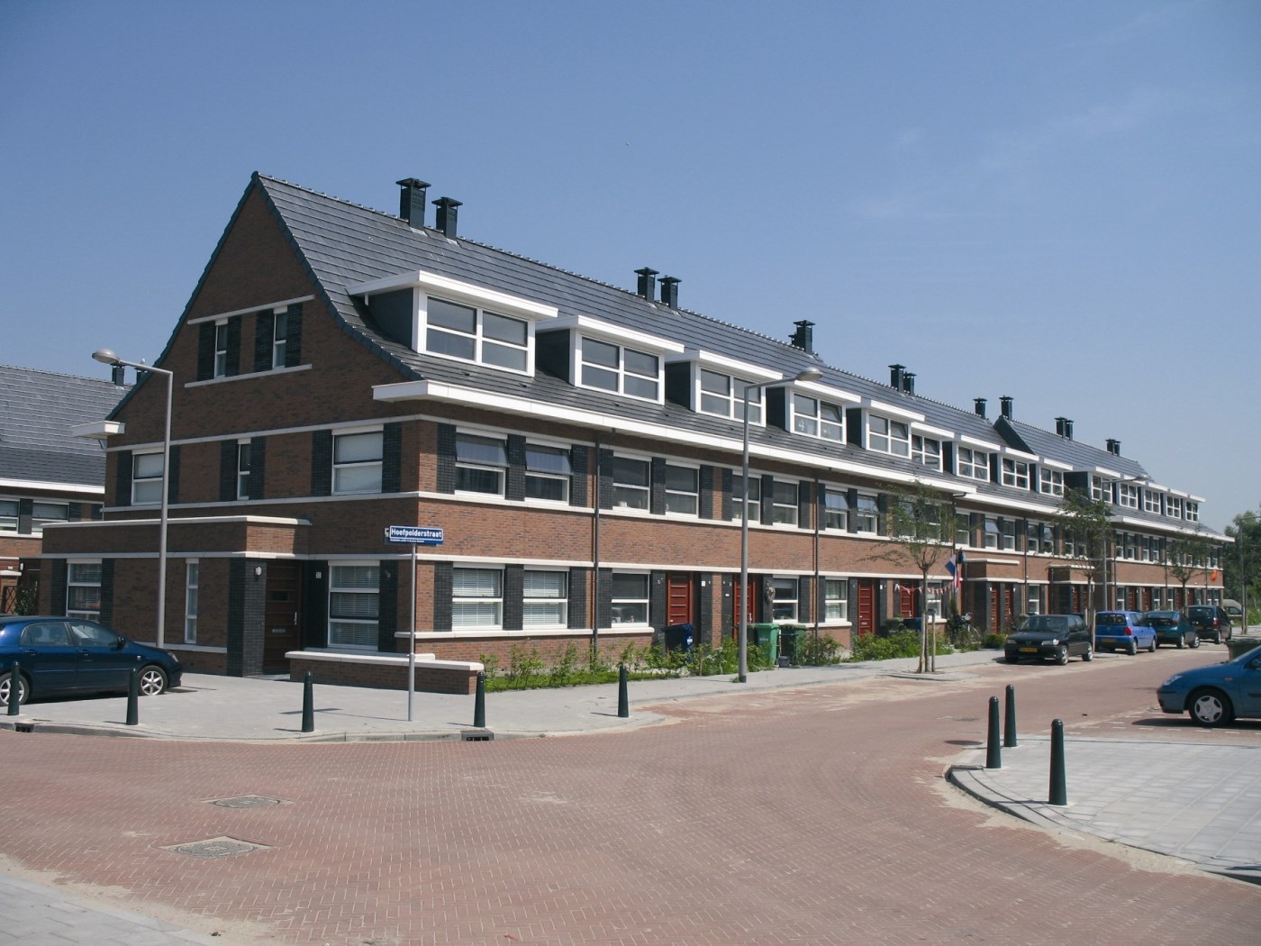 ‘Verscheidenheid in eenheid brengen, dat was de uitdaging’, aldus projectarchitect Joris Molenaar. ‘Een strak recept, maar een grote variëteit in typen.’ Dat recept is de klassiek-modern ogende, destijds revolutionaire ‘prairiehouse style’. Die komt uit Lloyd Wrights vroege oeuvre en kenmerkt zich door baksteenarchitectuur met strakke, bijna uitsluitend horizontale lijnen en strenge ritmes van muurpenanten en raampartijen. Molenaar kan er naar eigen zeggen goed mee uit de voeten. ‘Die bijna rigide kubische compositie met zijn ‘treinen’ van raamstroken vind ik een heel sterk punt. De enige diagonalen zijn de flauwe hellingen in de dakconstructie. Als architect probeer ik zulke ijkpunten te vangen en op een bepaalde manier uit te vergroten, er nieuwe inspiratie in te brengen.’