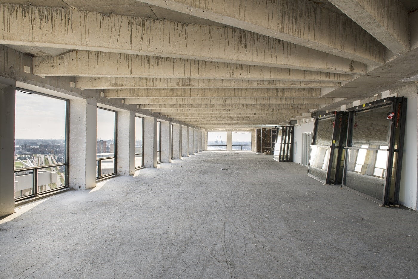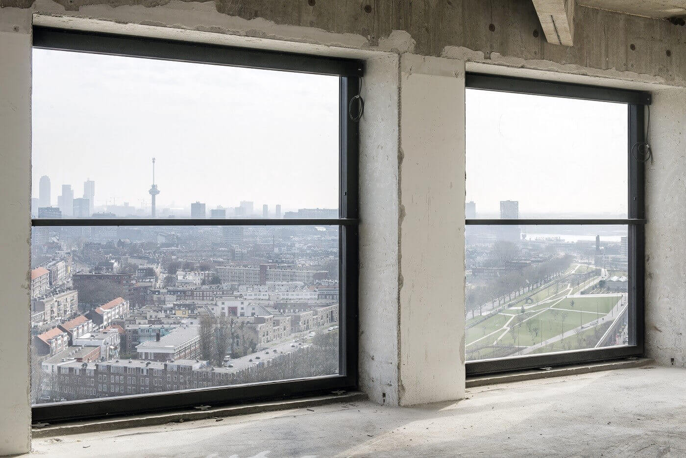 De appartementen krijgen royale Methermo®XL verticale schuiframen van Metaglas, waarmee de woonkamers kunnen worden omgetoverd tot een sfeervolle buitenruimte. Deze slank geprofileerde ramen vervangen de oude vaste ramen, zonder het beeldbepalende karakter van de gevel aan te tasten. Van Ekeren: “Het gebouw blijft net als in de oude situatie mechanisch geventileerd, maar bewoners hebben nu wel de mogelijkheid om een raam open te zetten.” Het gros van de verdiepingen heeft ramen van 2,80 m breed bij 2,80 m hoog. In de plint en op de 22e en 23e etage zijn de ramen tweemaal zo hoog. De helft van elk raamoppervlak is schuifbaar met behulp van elektrische bediening. Alle ramen, met uitzondering van de plint, zijn voorzien van bronskleurig glas van 2 x 8 mm dikte. “Dit is dezelfde kleur als het oorspronkelijke glas. Hierdoor sluit het nieuwe gevelbeeld nauw aan bij het oude en dat was een belangrijke eis van de welstandscommissie.”