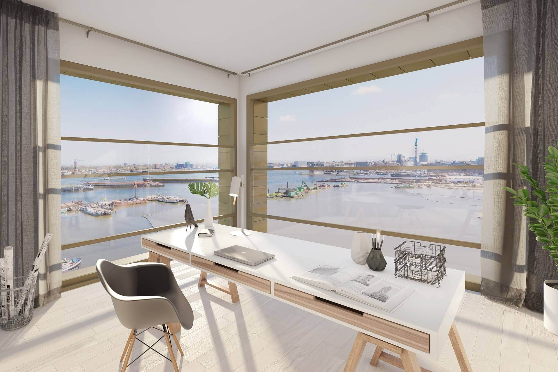 Behalve blikvanger is Frame vooral ‘blikbieder’. Het robuuste gebouw staat op de kop van de Haparandadam en gunt de bewoners een prachtig panorama op Amsterdam en het IJ. Dat uitzicht bepaalde grotendeels het ontwerp van Van Dongen-Koschuch Architects. De verdiepingshoogte is minimaal drie en maximaal vier meter op de bovenste verdieping. De raampartijen gebruiken deze hoogte volledig.