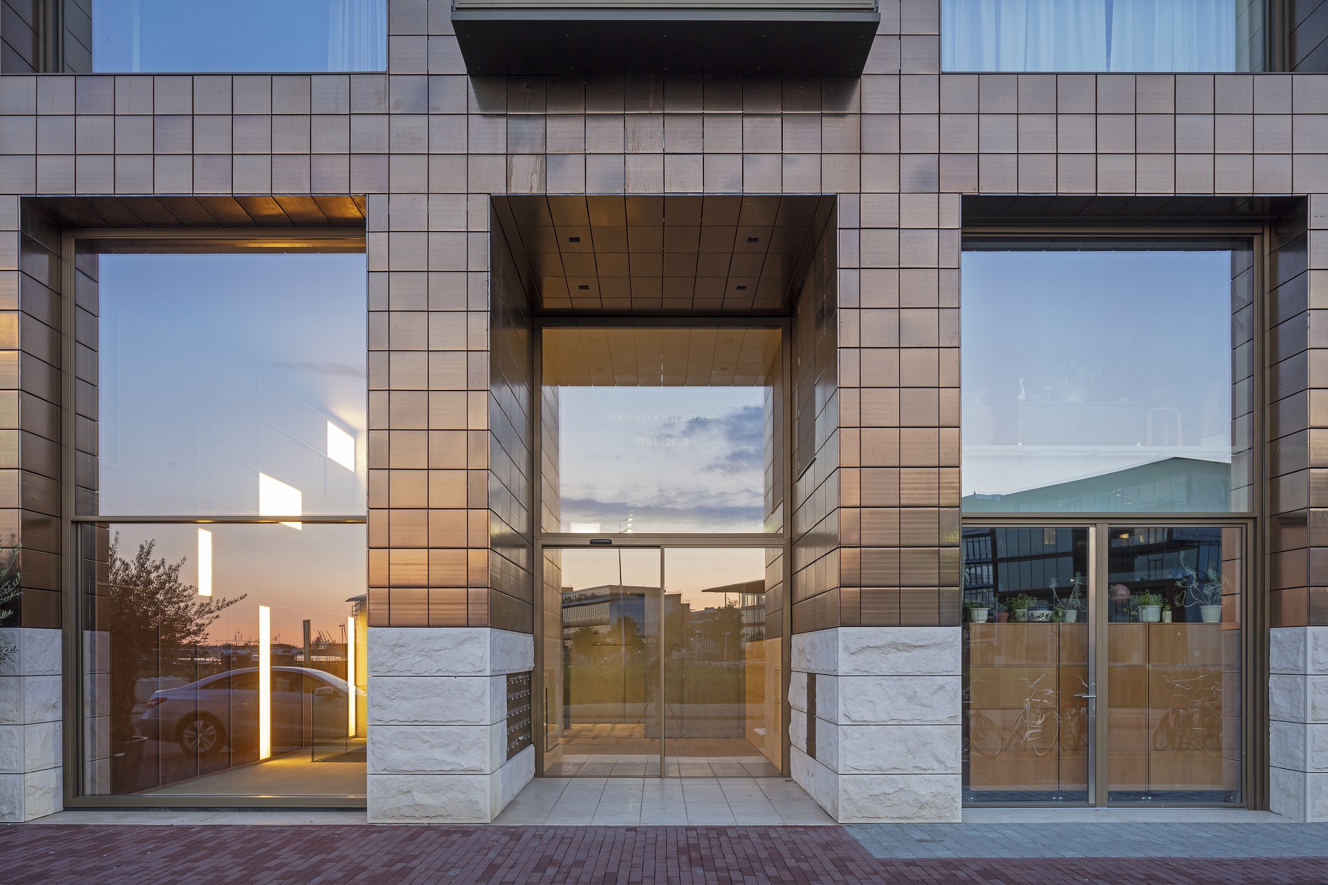 Frame lijkt opgebouwd uit gestapelde kubussen. De markante buitenzijde is bekleed met speciaal ontwikkelde gouden tegels. Volgens architect Ralph van Mameren pikken de tegels het buitenlicht mooi op, van helder geelgoud overdag tot bronsachtig in de avonds. ‘De kleur van de raamlijsten is hier op afgestemd, de enorme schuiframen creëren goudomrande schilderijen.’