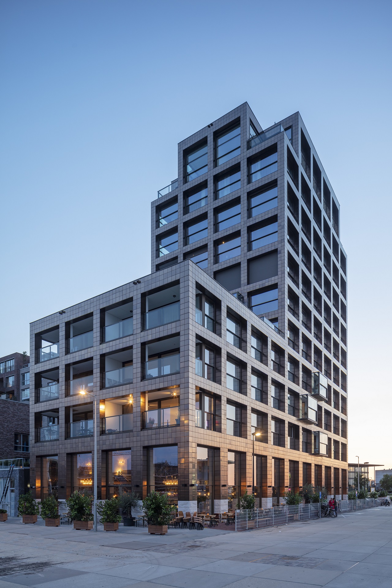 In een haven is altijd lawaai. Frame bevindt zich op de kop en functioneert als een geluidbuffer voor de bebouwing erachter. De havenzijde van het gebouw is dan ook uitgevoerd met beglaasde balkons.