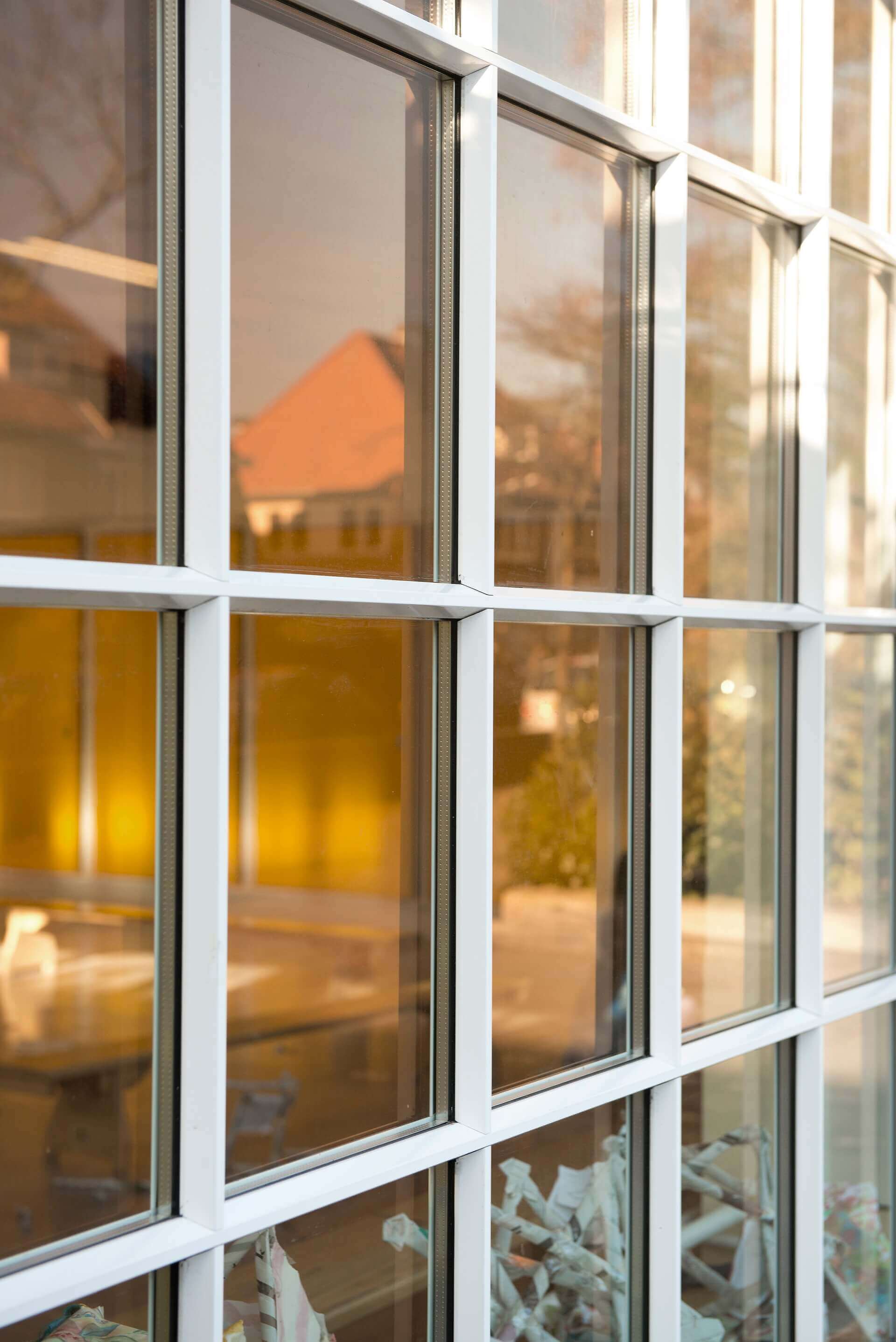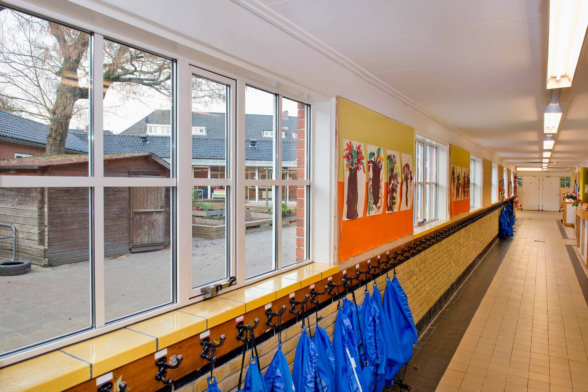 ‘De gemeente Hilversum (opdrachtgever, red.) wenste het comfort in de school en de klaslokalen sterk te verbeteren. Daarbij wilde ze de oorspronkelijke uitstraling van de school zoveel mogelijk intact te laten’, zegt projectleider Ronald Veltman van Van Hoogevest Architecten. Aan beide wensen is volgens hem voldaan door de originele stalen ramen te vervangen door ramen uit de Methermo Classiclijn van Metaglas. ‘Die komen qua afmetingen heel dicht bij het originele stoeltjesprofiel en zijn voorzien van HR++ glas en een geïsoleerd aluminium profiel. Die zorgen voor optimale isolatie van de ramen.’