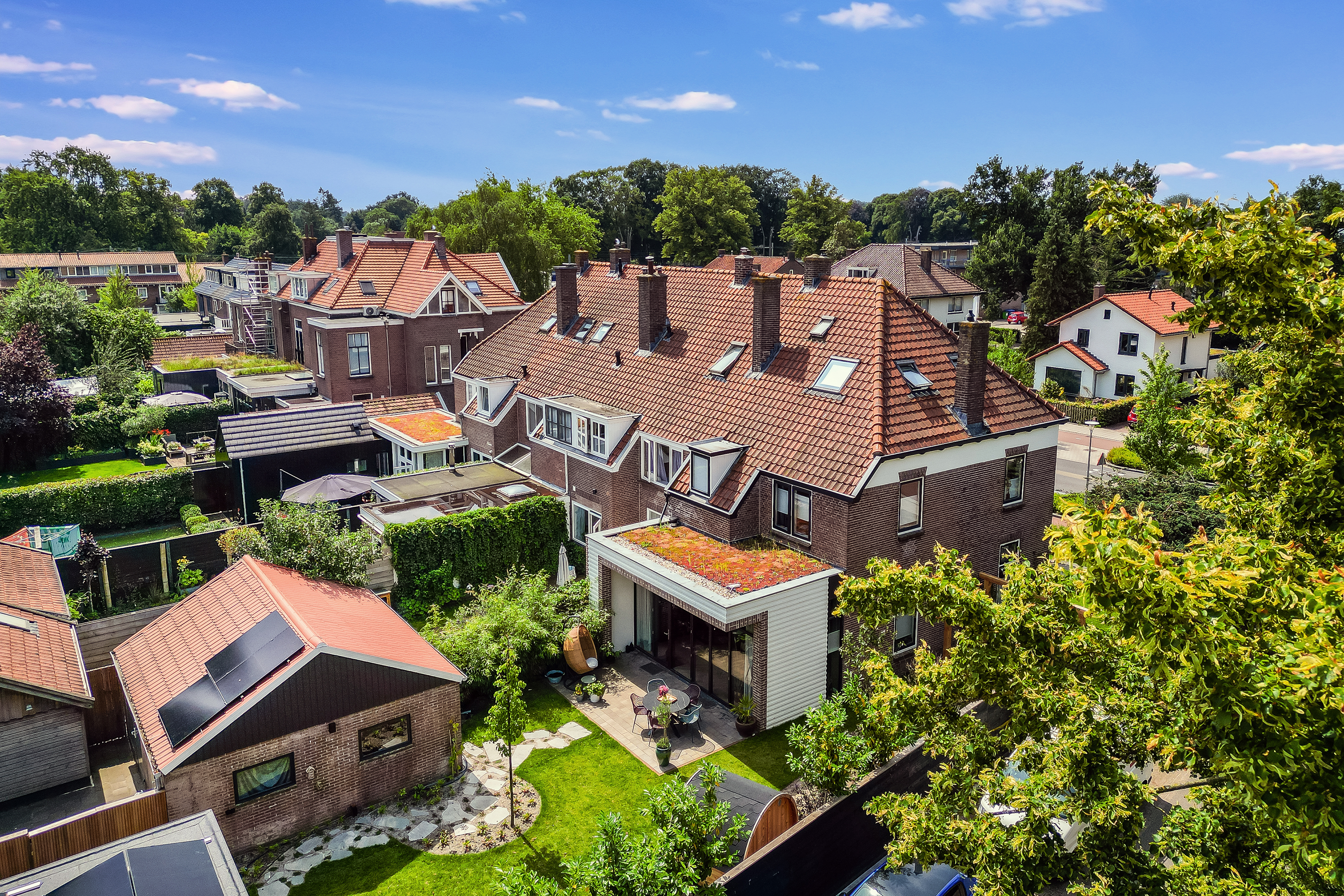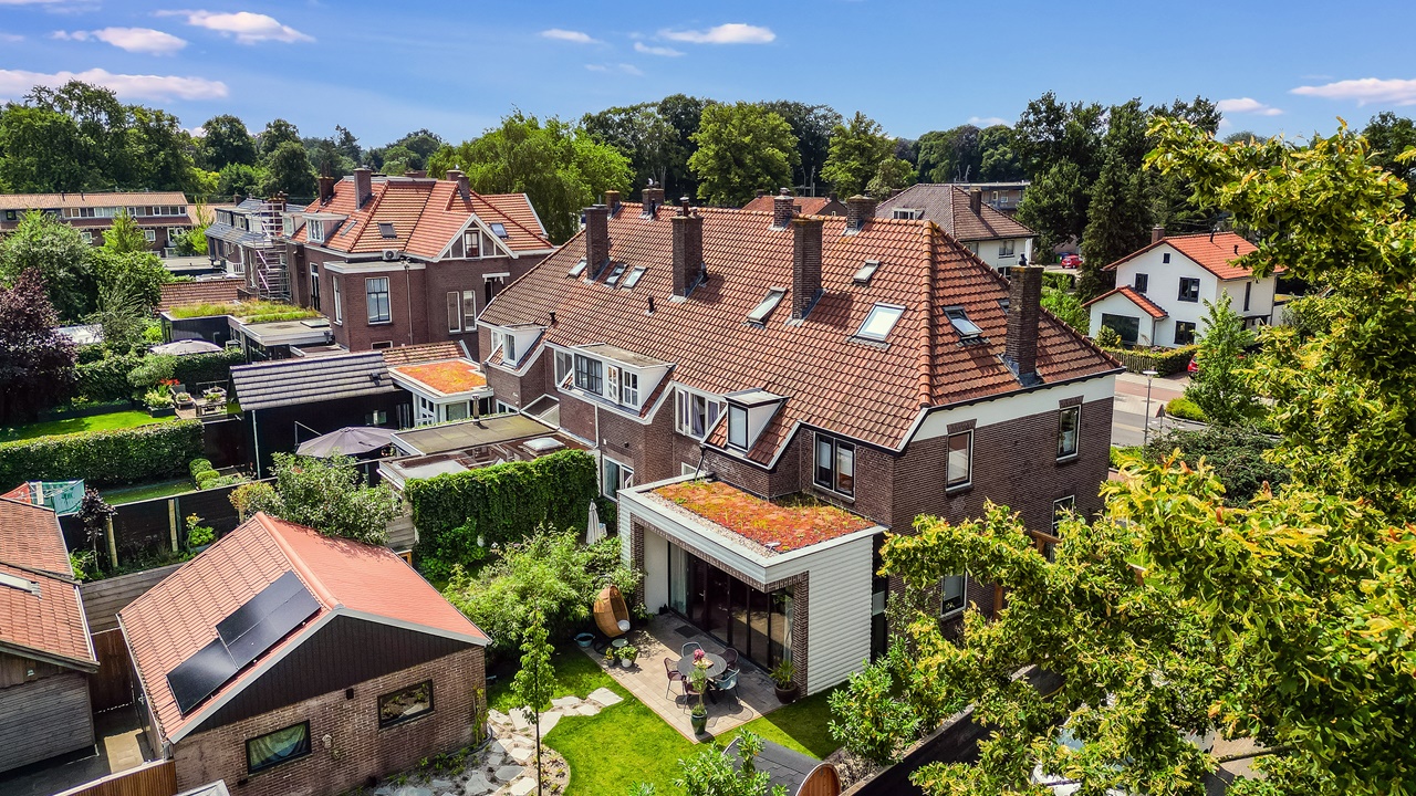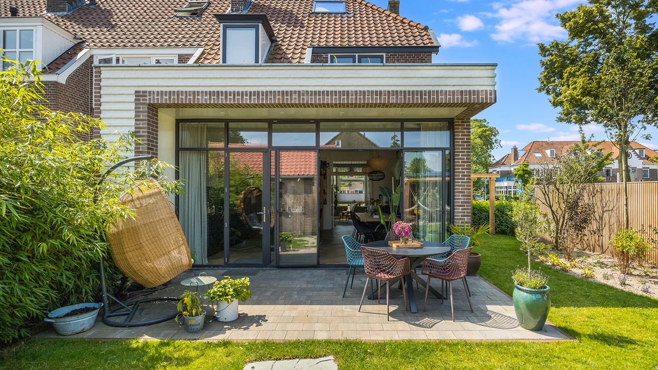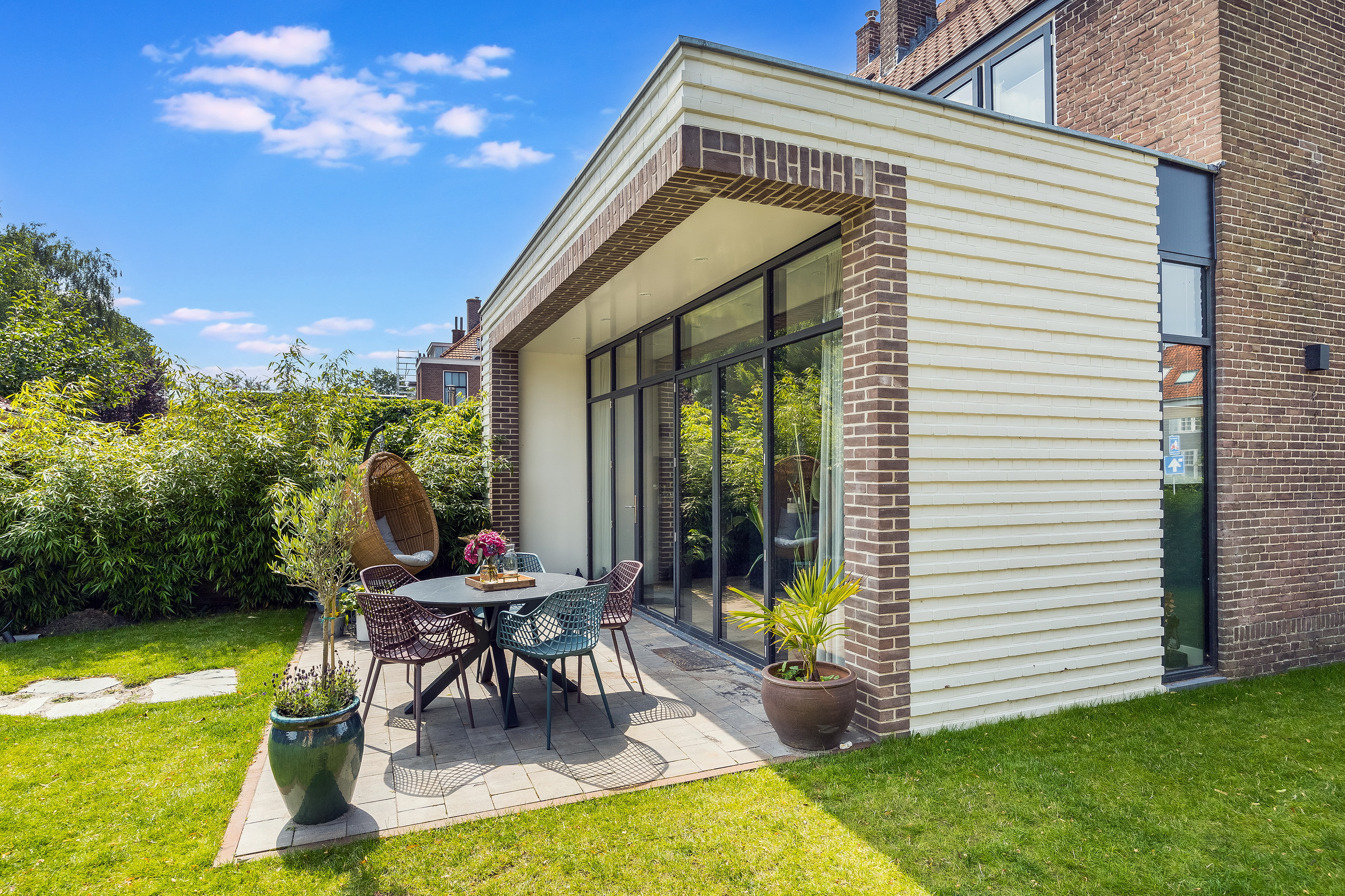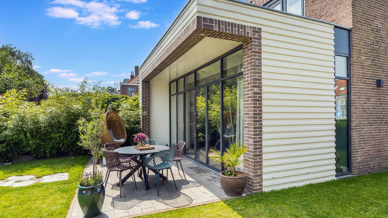 De uitbouw van dit monumentale pand springt direct in het oog door het grote overstek met zwevend wit metselwerk. Onder dit overstek is een groot aluminium kozijn met openslaande deuren geplaatst, dat een vloeiende overgang tussen binnen en buiten creëert.
