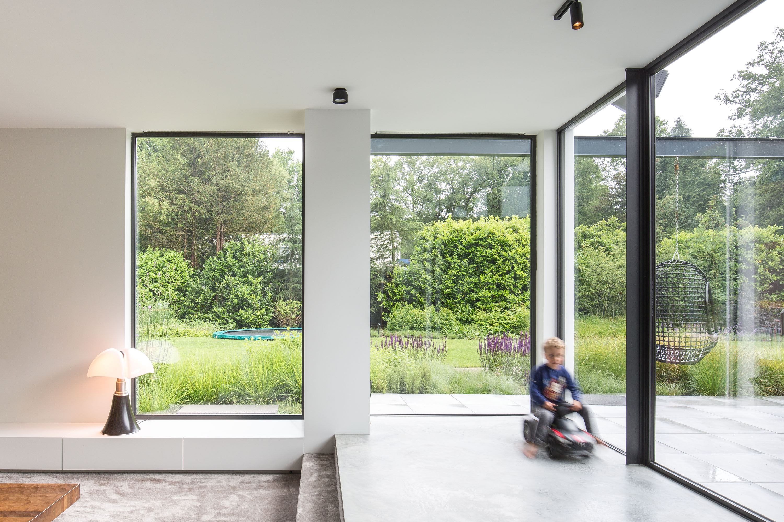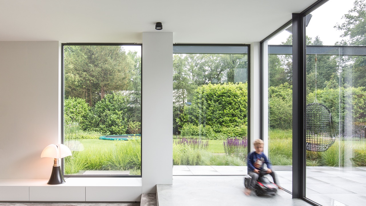 De villa bestaat uit grote open ruimtes die op elkaar aansluiten. Daarbij hebben de bewoners voor een hoog plafond gekozen. Dit zorgt ervoor dat de ruimtes nog groter worden. De ramen lopen door vanaf de grond tot aan het plafond. Dit zorgt voor maximale transparantie en veel lichtinval in de woning. Daarnaast loopt de vloer vanuit de woning vloeiend over in de betegeling van het terras. Zo zijn de tuin en de woning echt één geheel en is alles op een gelijk niveau.