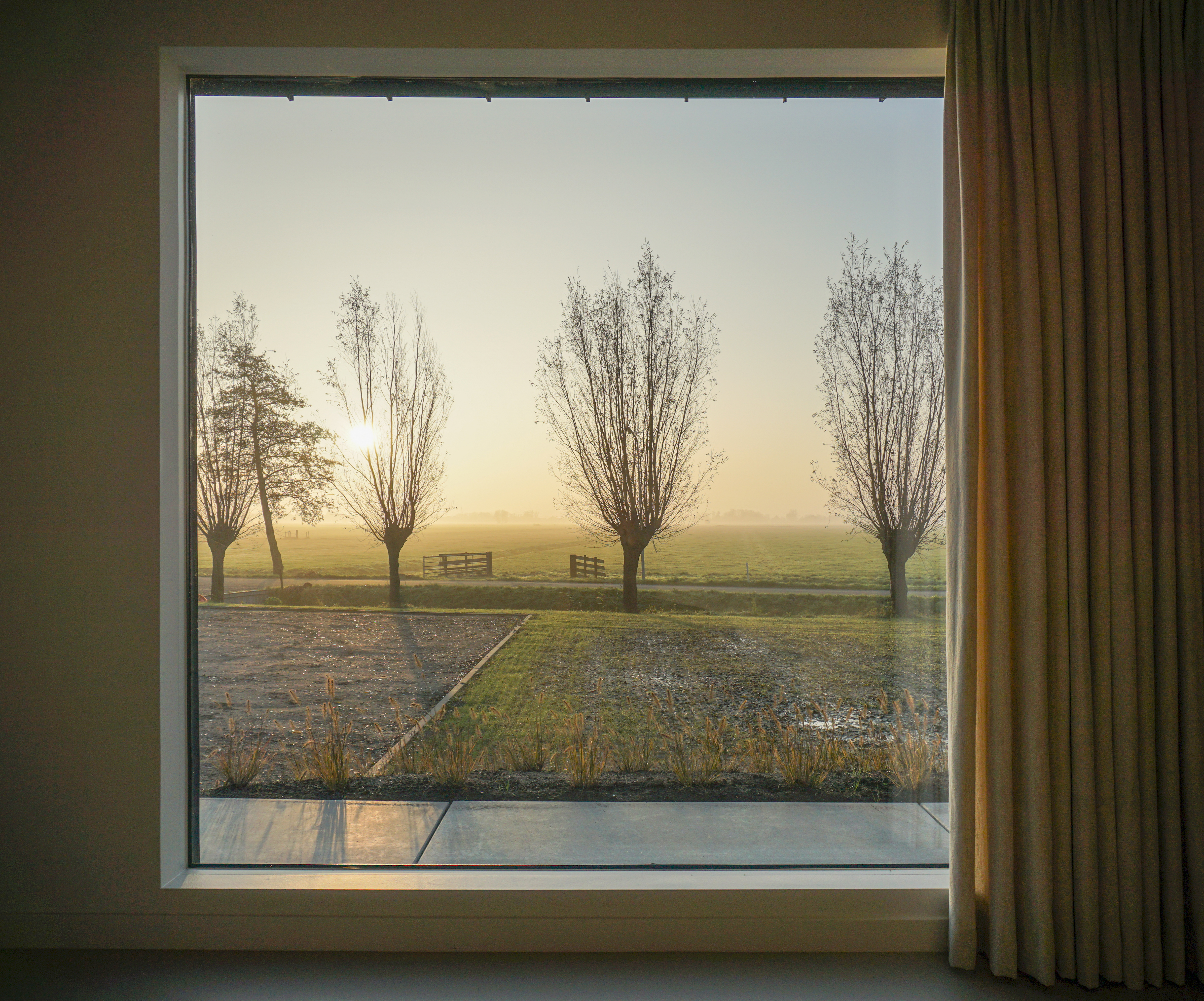 De kozijnen zijn uitgelijnd op de hele breedtematen van de felsbanen en in iedere felsbaan passen weer vier planken. Zo wordt het complete plaatje tot één geheel gemaakt. De toepassing van MethermoXL kozijnen met grote glasoppervlakten en minimalistisch profielgebruik zorgen voor een fraai vergezicht met maximale transparantie.