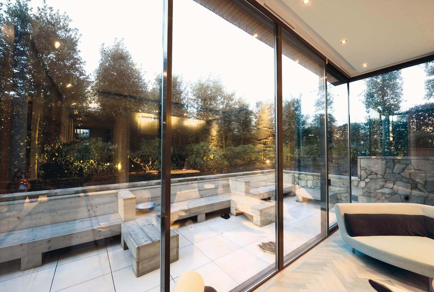 De schuifpuien zijn tot wel 3,60 meter hoog. Heida: ‘We hebben ons vooraf afgevraagd of deze uitzonderlijke hoogte verstandig was. Het was een uitdrukkelijke wens van de opdrachtgever; Metaglas ging met succes de uitdaging aan. Ook de gevel aan de kant van de gym is, mede op voorspraak van Metaglas, volledig van glas.’ Als onderdeel van een totaaloplossing droeg Metaglas ook zorg voor een beloopbaar matglazen daklicht in de vloer van de patio boven de werkkamer. Heida: ‘Dat vind ik het mooie aan het bedrijf: dat het lef en durf toont en daadwerkelijk meedenkt in oplossingen.’