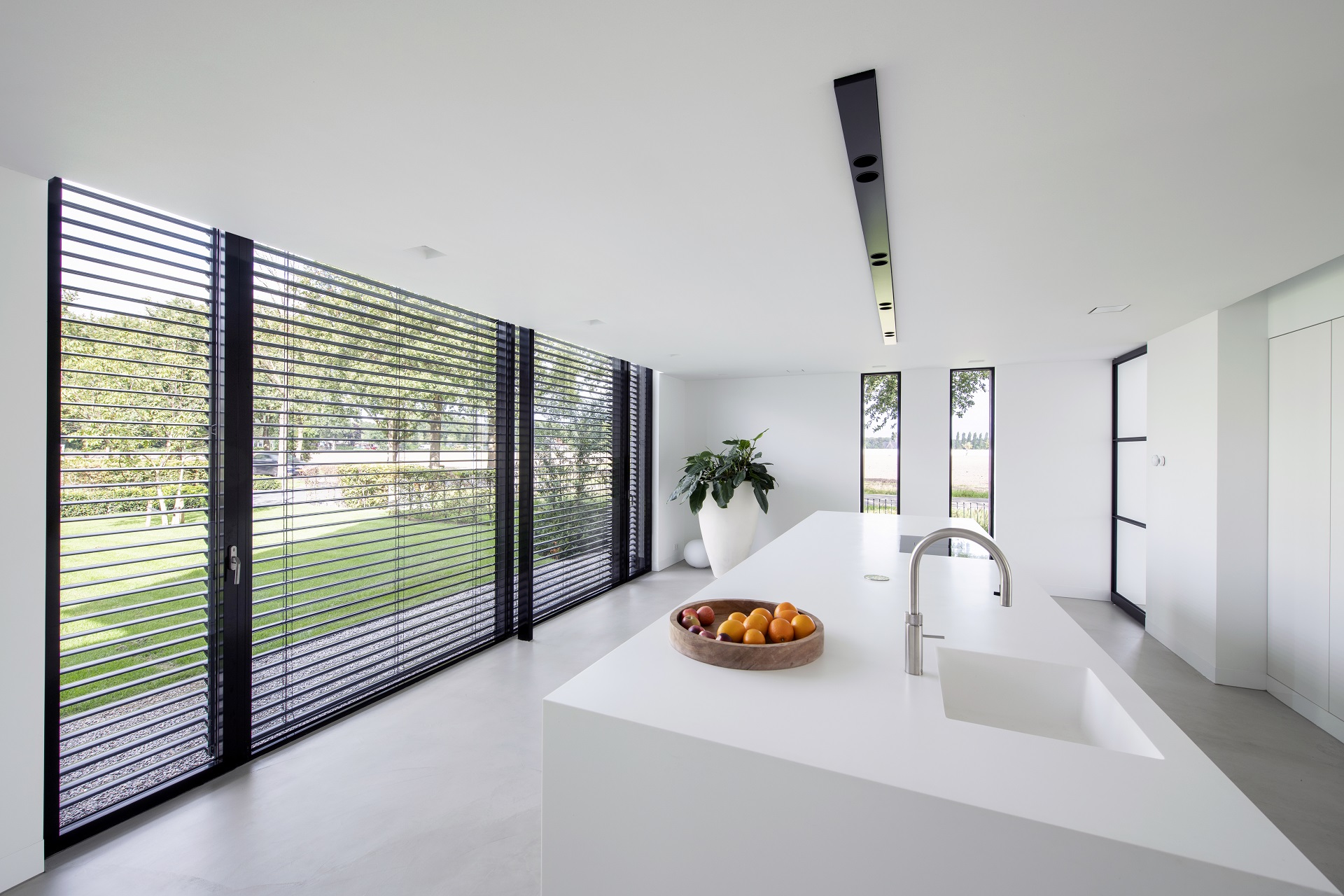 In het creëren van de strakke lijnen en vormen had Van de Sande volledig de vrije hand, maar in het totale ontwerp en de ligging van de woning was de locatie leidend, vertelt ze. ‘Het huis hoort bij het tuindersbedrijf dat vlak achter de woning ligt. Het bedrijfspand sluit de woning aan die kant af. De voorzijde van het huis biedt vrij uitzicht, maar ligt aan een vrij drukke weg. De tuin is daarom gelegen aan weerszijden van het huis, waarop we besloten om de zijgevels zo open mogelijk te maken.’