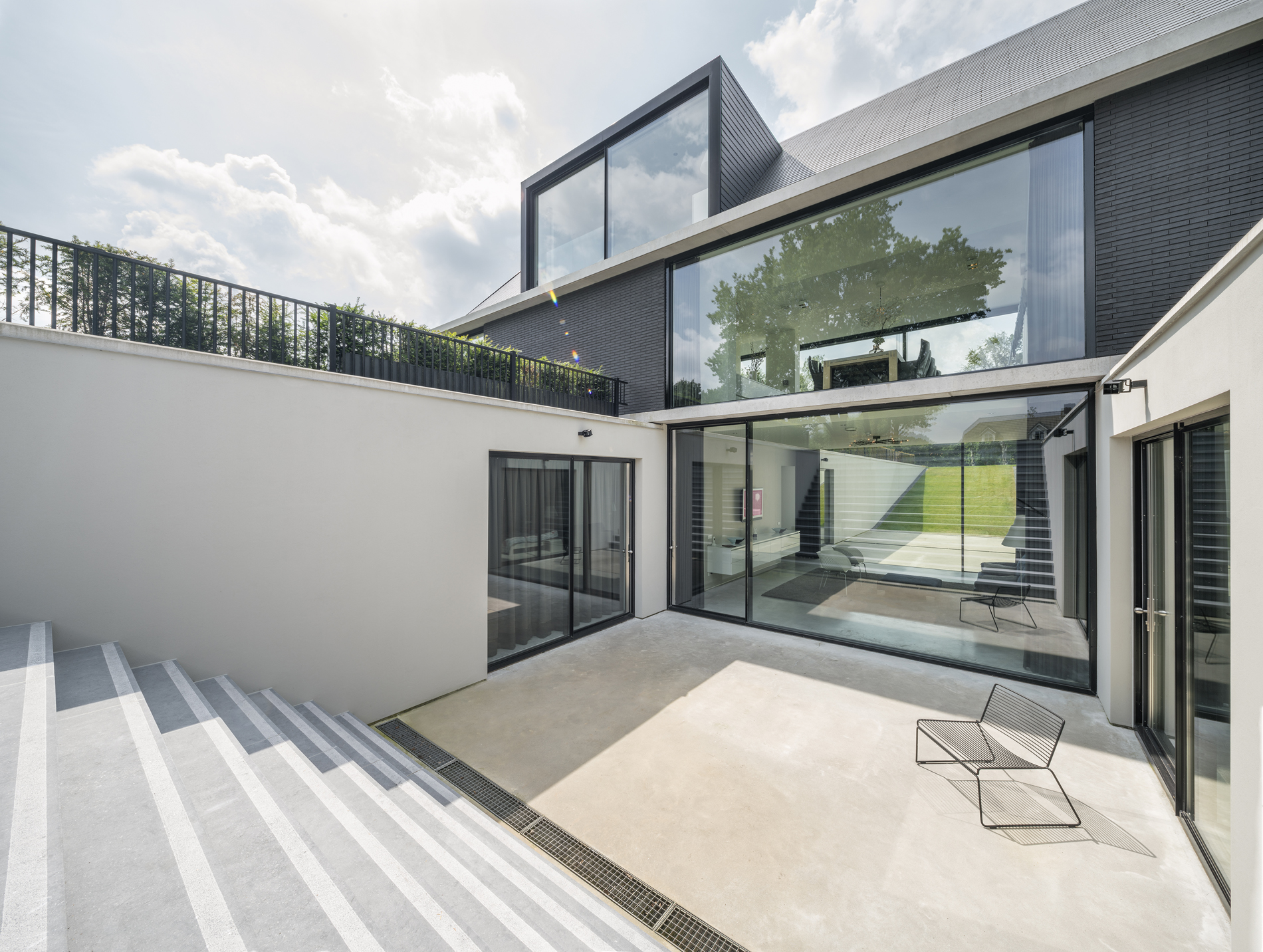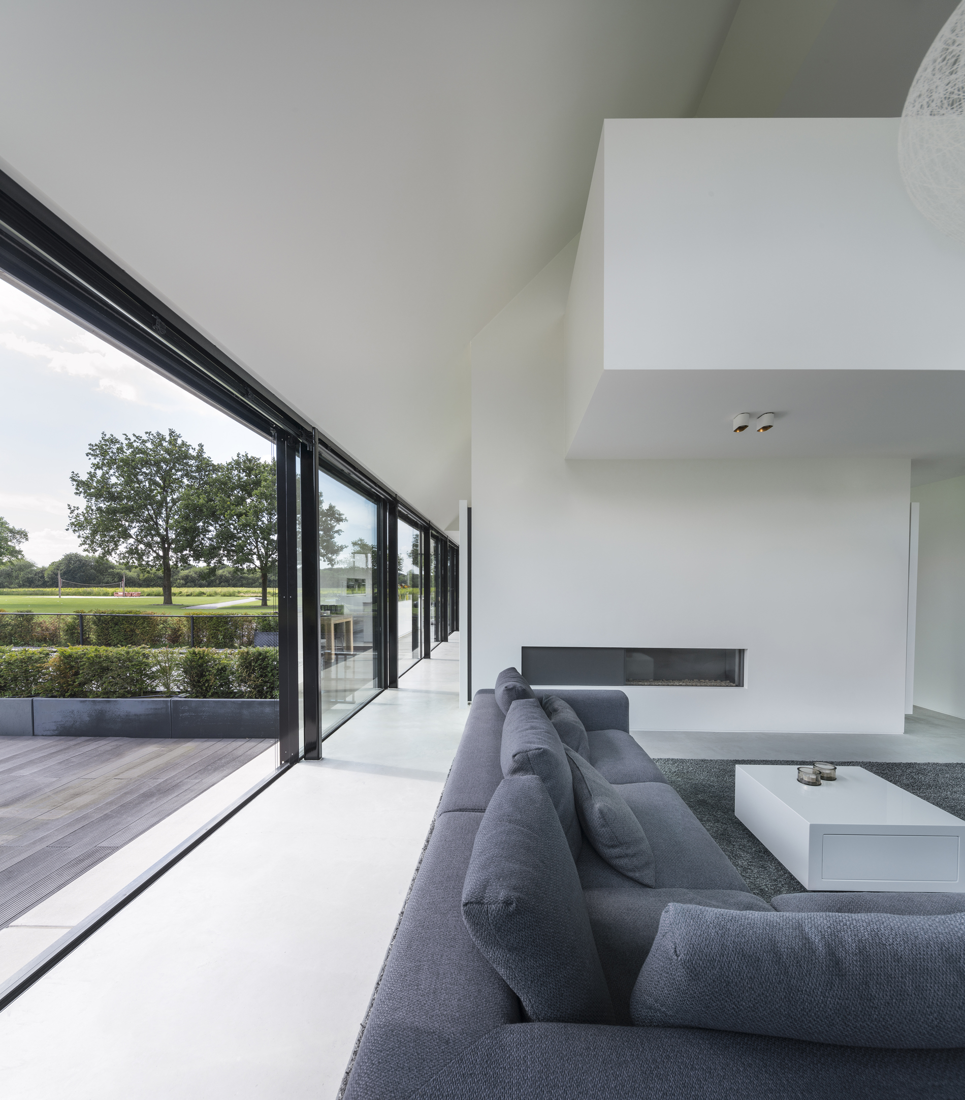 Tot slot benadrukt Michiel Hofman het belang dat zijn bureau hecht aan de verbinding tussen binnen en buiten. Bij deze villa speelt de hellingbaan daarin een sleutelrol: die ‘verankert’ de woning in het landschap. ‘De helling ziet er nu nog architectonisch uit. Straks, als hij begroeid is, vouwt het landschap zich als het ware naar beneden. Elke kamer komt dan direct uit op de tuin en staat rechtstreeks in verbinding met de natuur. Je ziet de omgeving dus niet alleen goed, je kunt er ook meteen naartoe.’