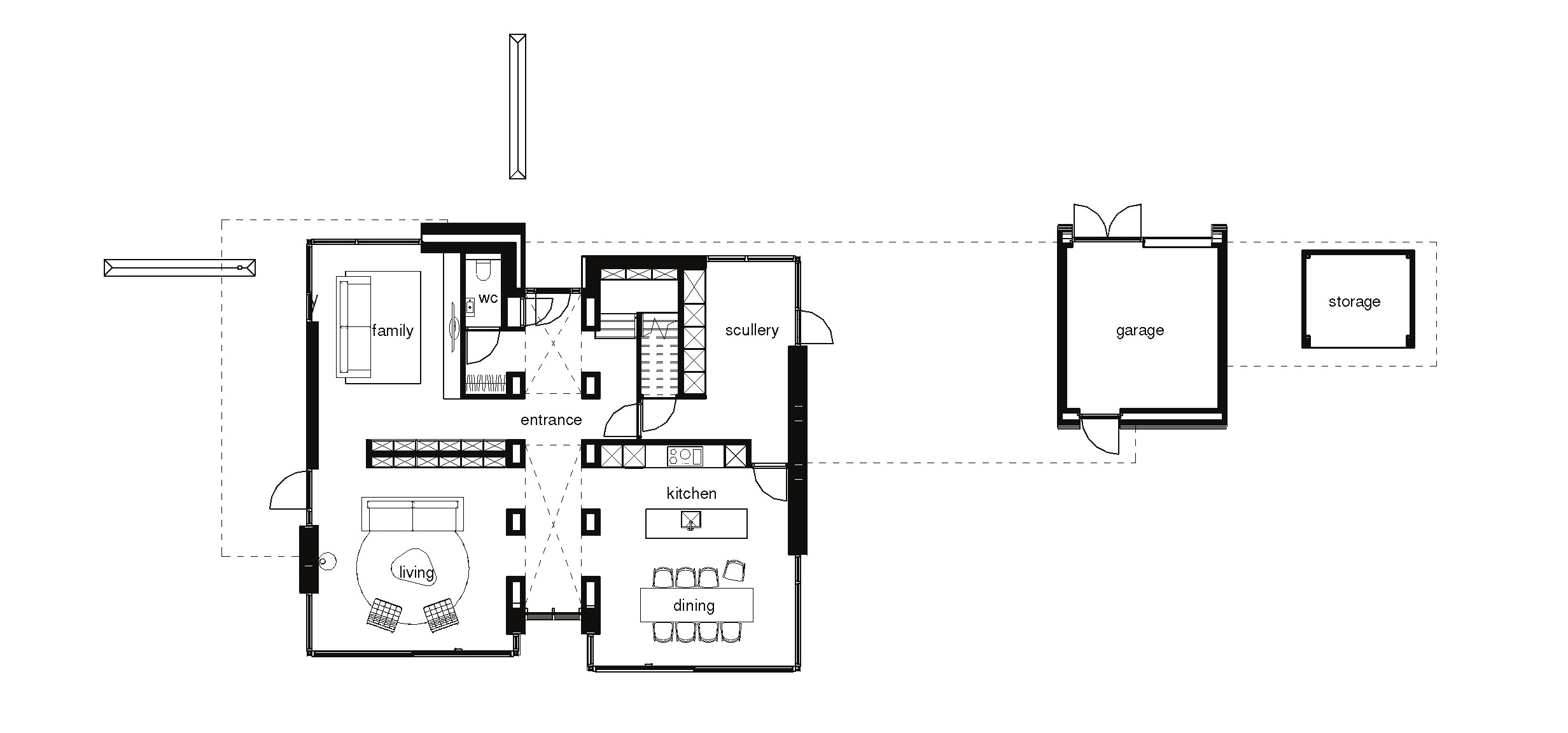 Om warmteverlies te voorkomen is de hoeveelheid glas op het noorden beperkt gehouden, maar verder vormt de begane grond een geheel met de omgeving. De schuifpuien aan de achterzijde hebben dezelfde slanke belijning als de ramen. “Dit biedt de bewoners de mogelijkheid om de terrassen buiten bij de zitkamer en eetkamer te betrekken.” Doordat de glaspartijen iets verzonken zijn aangebracht in de façade ontstaat zowel optisch als qua lichtintensiteit een zachte overgang.