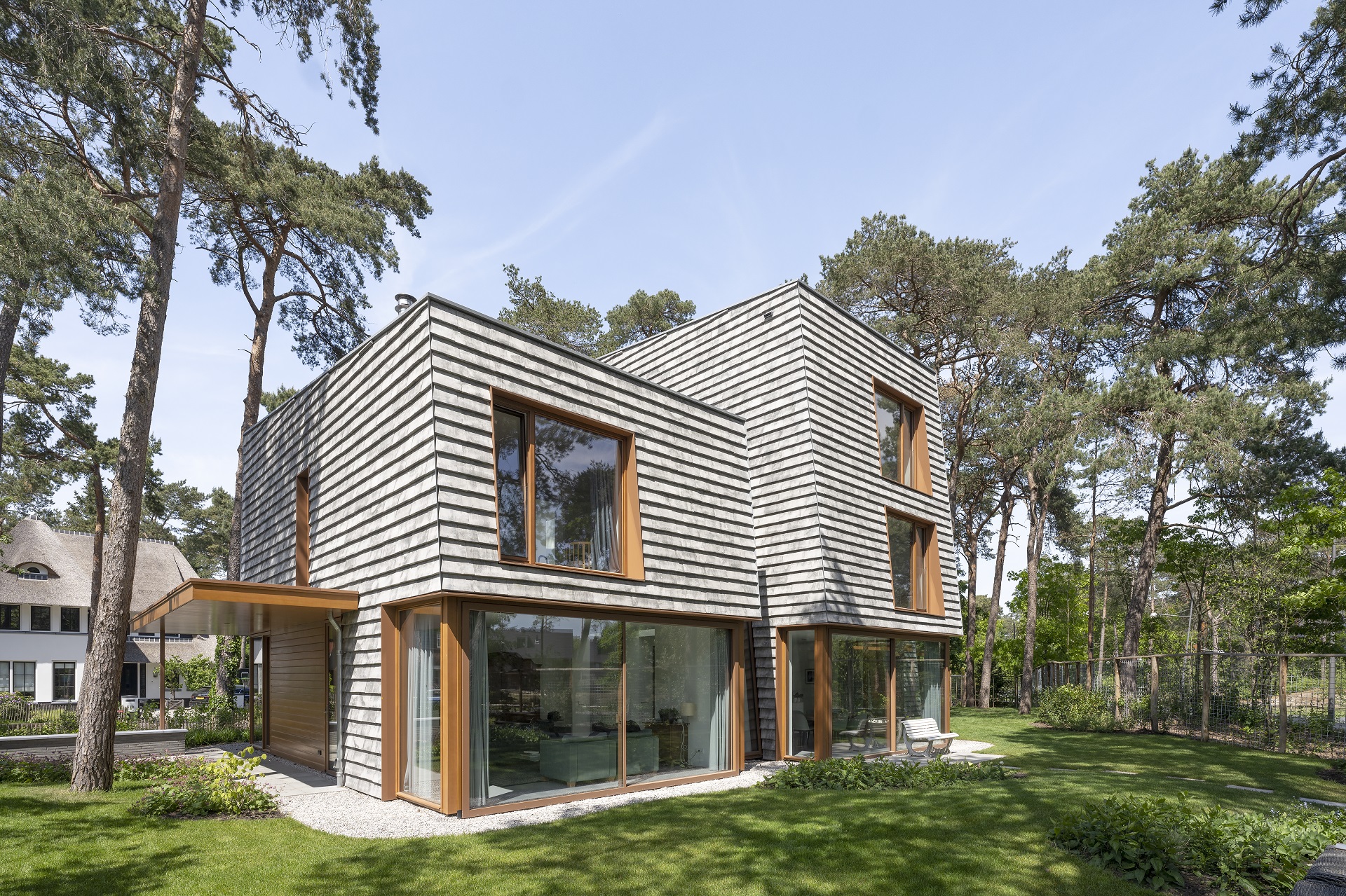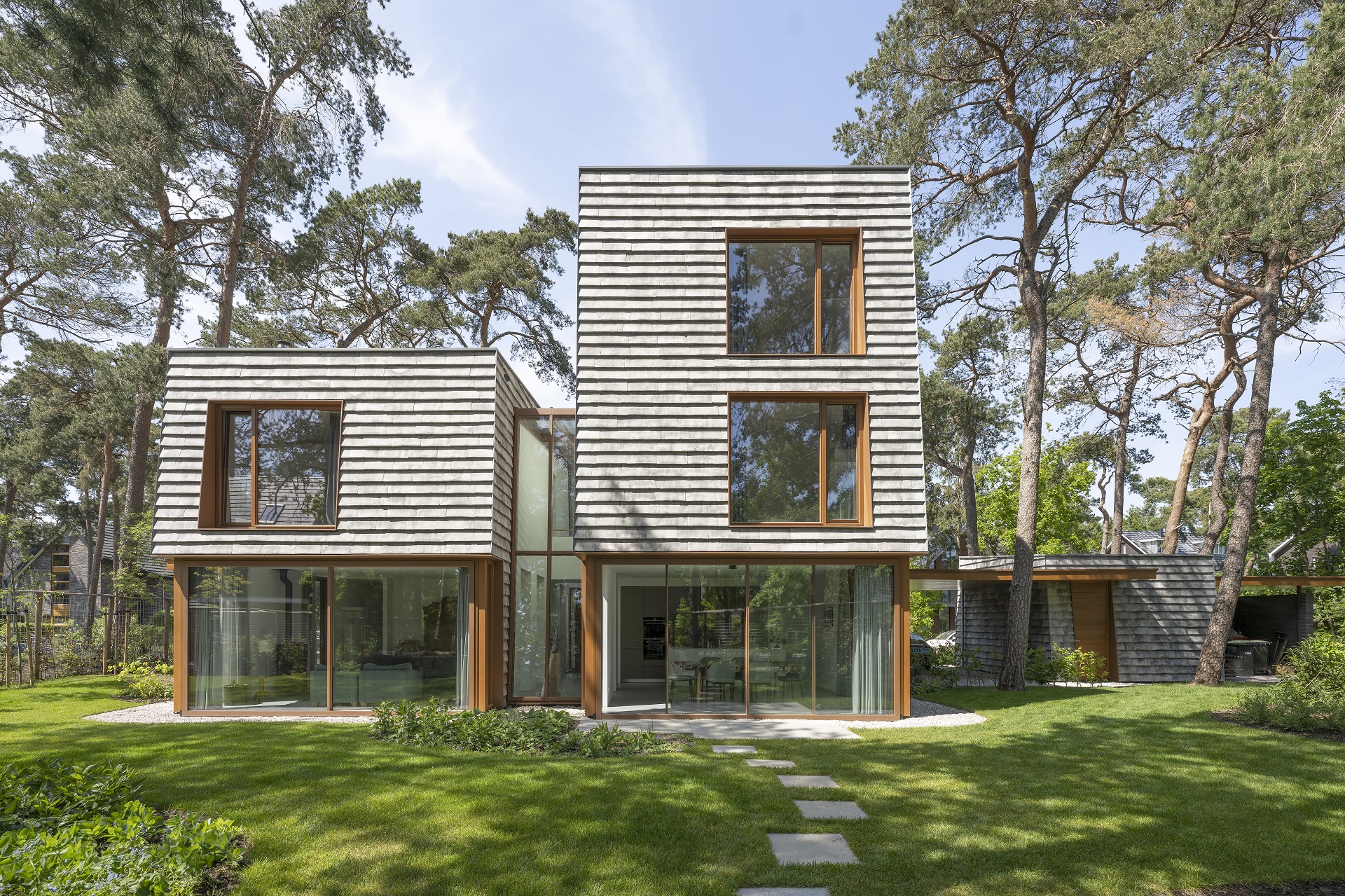 Mede door de lange horizontale luifel die de vier volumes aaneenrijgt en het blikveld verbreedt, oogt de villa van een afstand als één gebouw. Kom je naderbij dan zijn de volumes duidelijk te onderscheiden. De gevels verspringen iets ten opzichte van de rooilijn en worden verbonden door transparante verbindingen die de robuuste façade een zekere lichtheid geven. Een eigenzinnigheid die het perceel ook kent door vliegdennen die er staan. “Bij de keuze voor de keramische leipannen en kleur werden we geïnspireerd door deze dennen. Door de ruwe textuur en vorm lijken de gevelpannen bijna schubben. In combinatie met de lichte kleur ontstaat op de gevel een levendig schaduweffect wanneer zonlicht door de boomkruinen de gevel bereikt.”