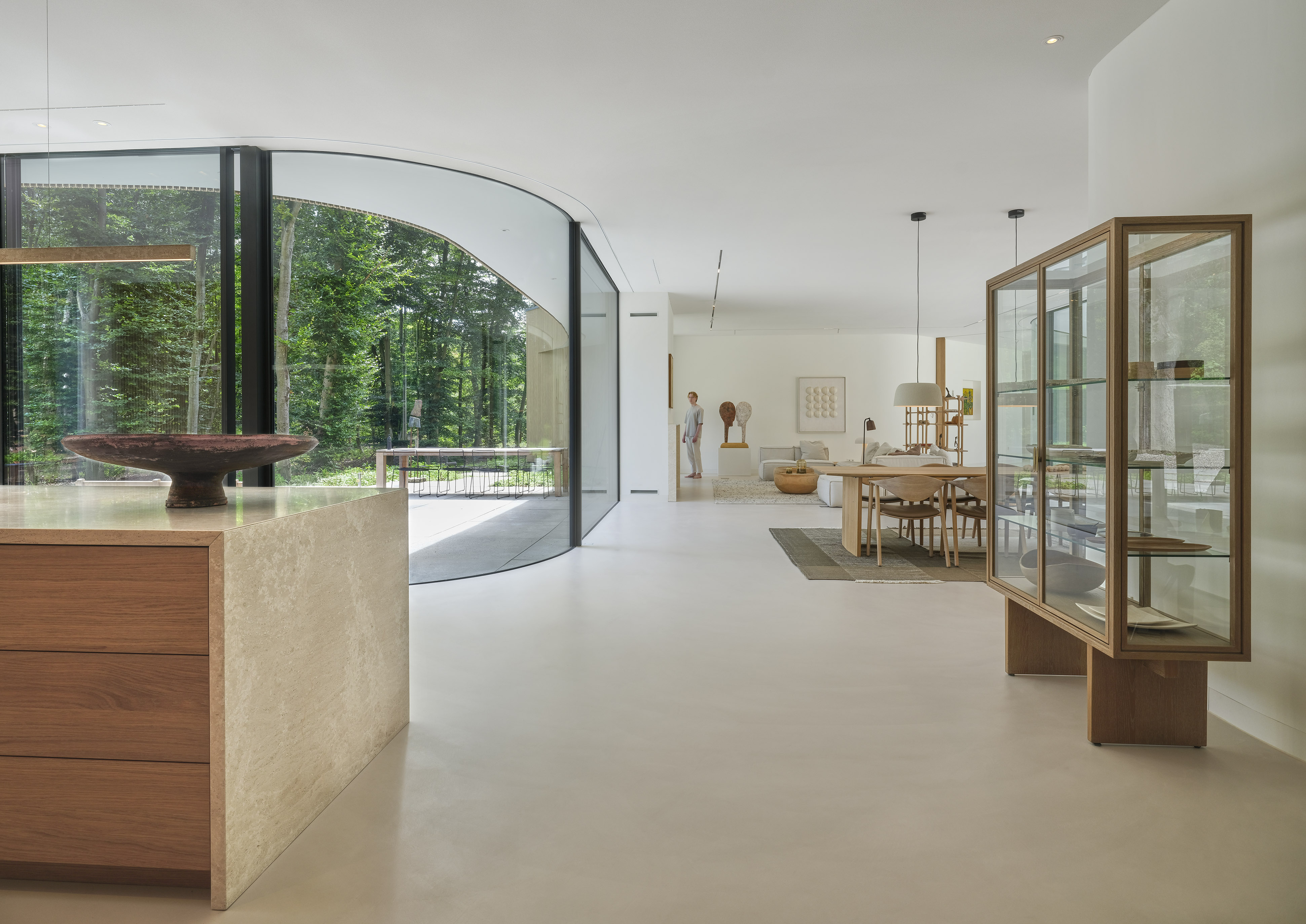 Het ontwerp van de villa werd geleid door de wens om zoveel mogelijk bomen te behouden. De gevel van de woning buigt vloeiend om de bomen heen, waardoor zowel binnen als buiten aangename ruimtes ontstaan. Dankzij de organische vorm integreert de villa harmonieus in de omgeving. Grote ramen van vloer tot plafond verbinden het interieur met het exterieur en bieden schitterende panoramische uitzichten op het omliggende bos.
