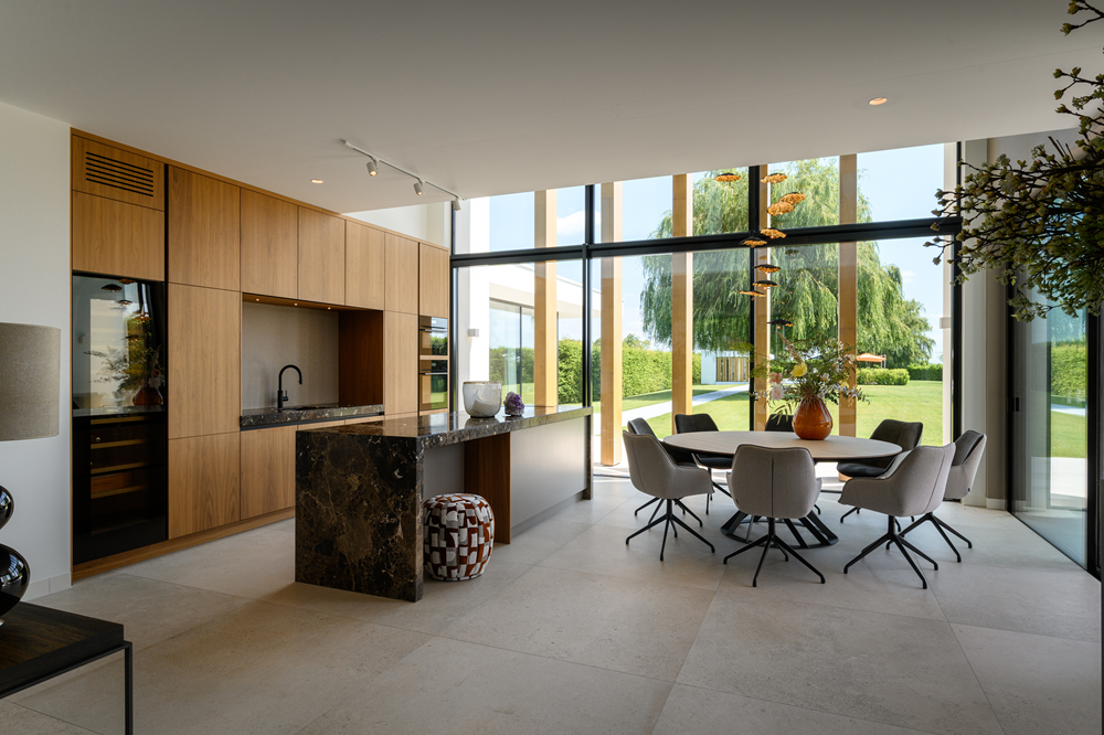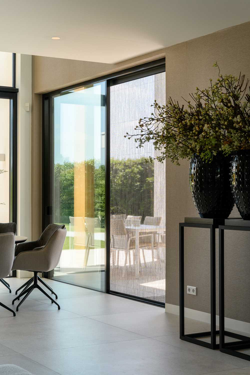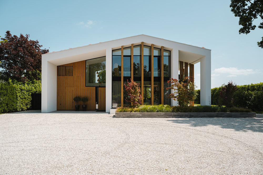 In het open landschap van Oud-Beijerland staat een moderne villa die rust en eenvoud ademt. De gevel is strak vormgegeven, met een subtiel spel van wit stucwerk, houtaccenten en grote glaspartijen. Vooral de achterzijde van de woning is een architectonisch statement: een imposante wand van glas, ritmisch onderbroken door verticale houten kolommen die tot aan de dakrand reiken. De asymmetrische daklijn geeft het geheel een krachtige, eigentijdse uitstraling. De toegepaste Methermo®XL schuifpuien en vaste aluminium ramen versterken deze visuele rust. Ze brengen niet alleen ritme en structuur, maar zorgen ook voor lange zichtlijnen door de hele woning. Transparantie en privacy gaan hier hand in hand.