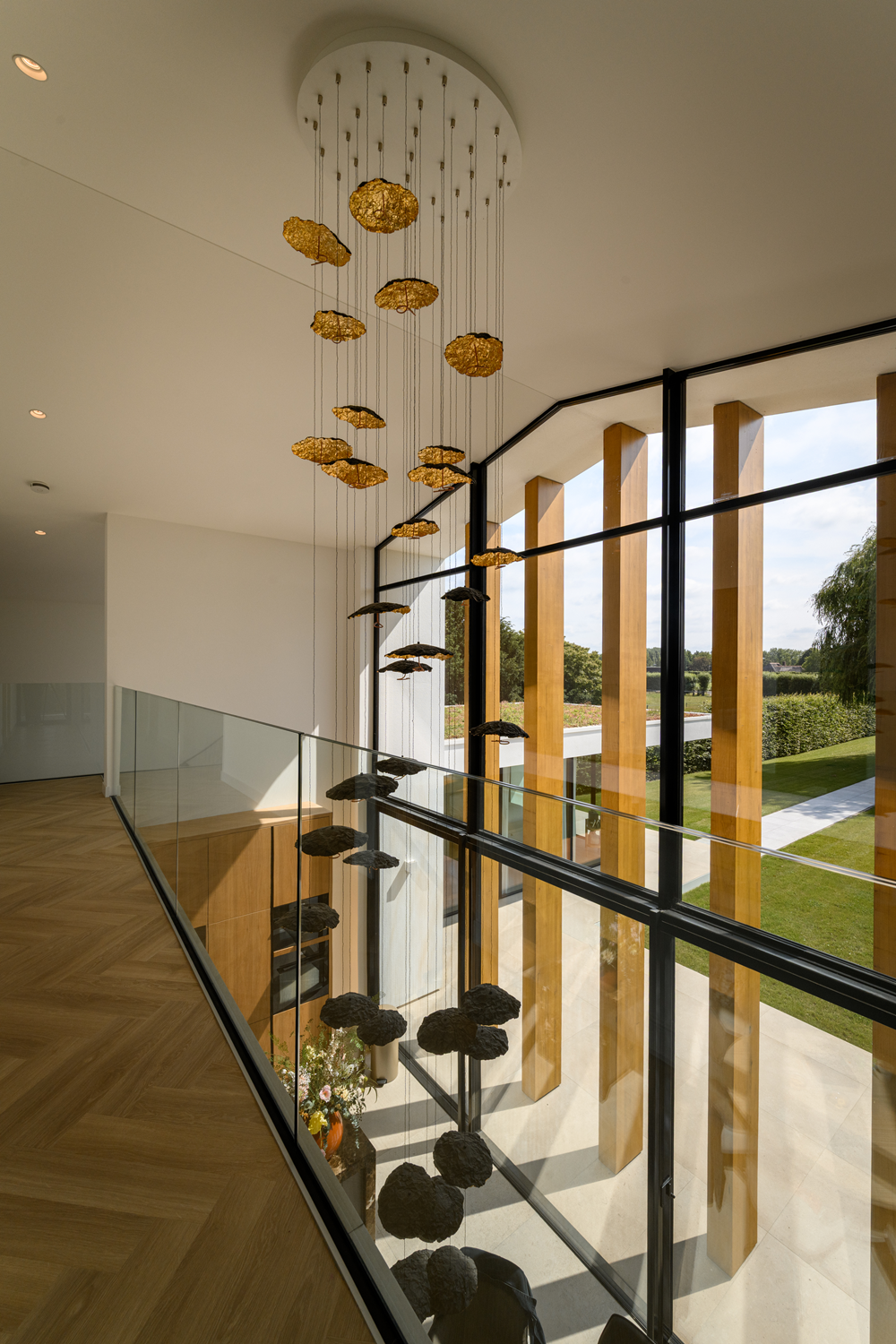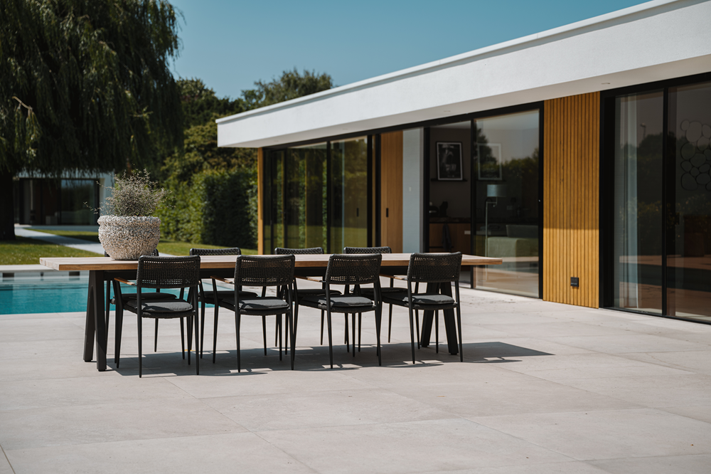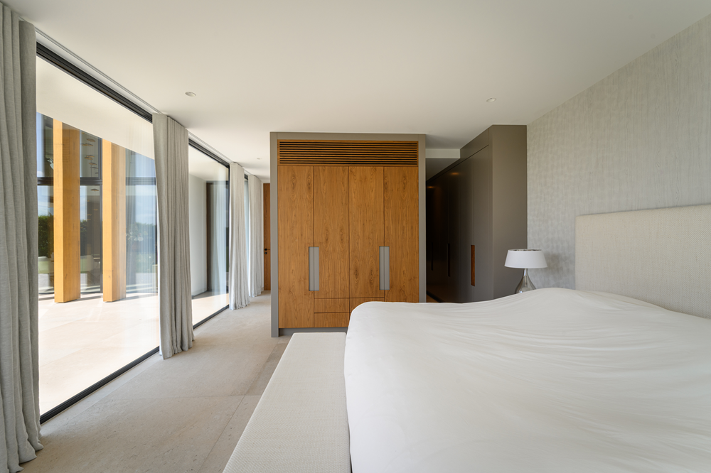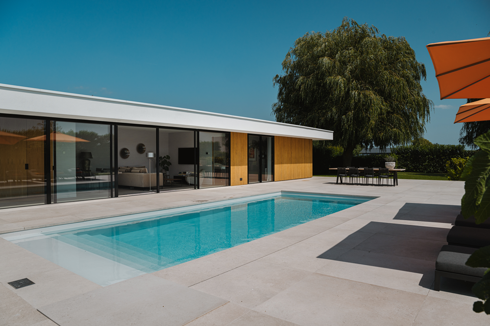 Achter in de tuin ligt een royaal poolhouse dat als een verlengstuk van de woning fungeert. Ook hier zorgen grote glazen schuifpuien voor een open uitstraling en maximale lichtinval. De vormgeving sluit naadloos aan bij het hoofdgebouw: dezelfde materialen, kleuren en detaillering zorgen voor eenheid en samenhang. Dankzij de maatwerkoplossingen van Metaglas blijft het lijnenspel zuiver, ook in het tweede volume.