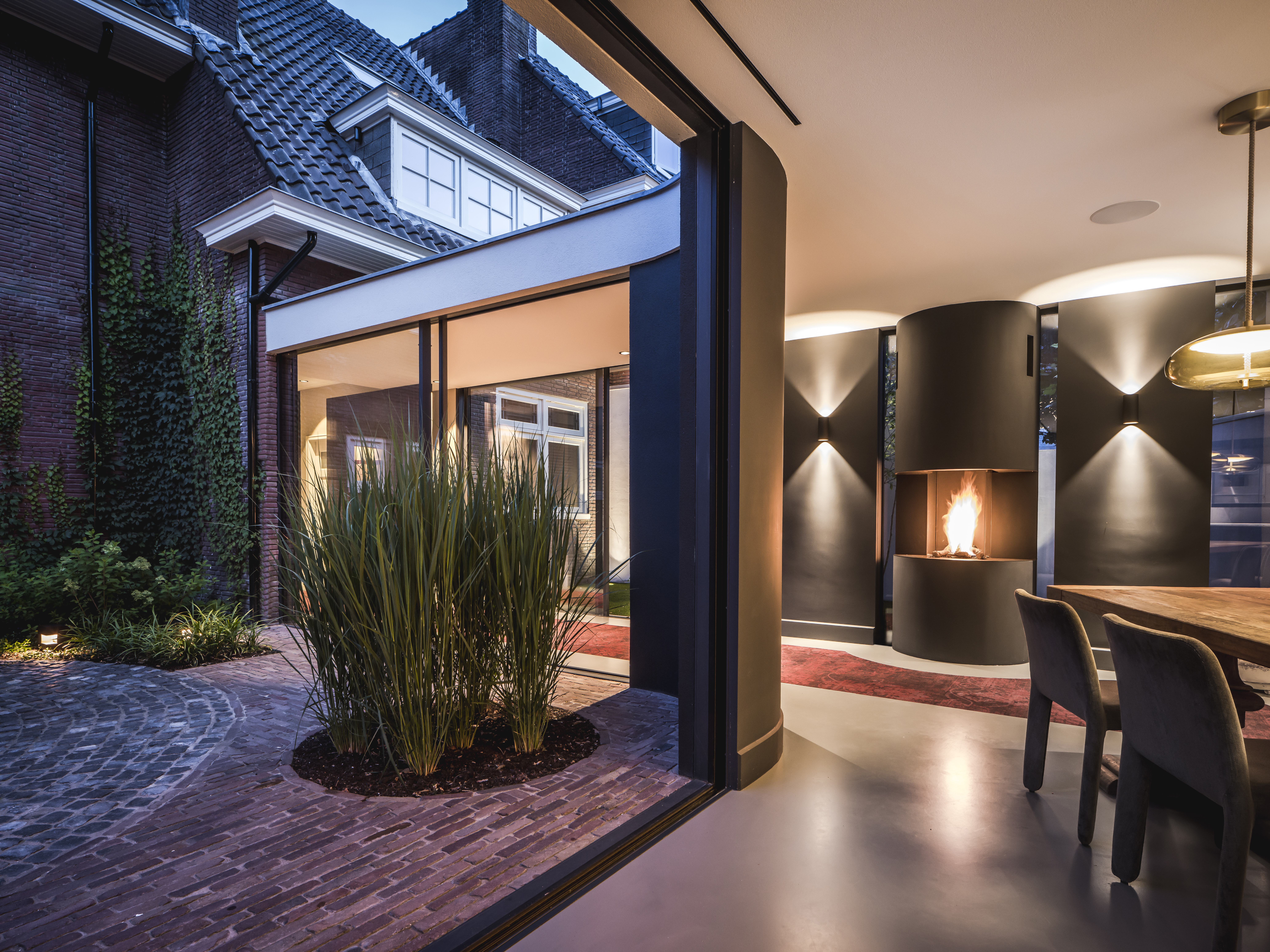 Bij het ontwerp is gekeken om de overgang van oud naar nieuw zo minimaal mogelijk uit te voeren. De nieuwe woonkeuken is gepositioneerd op de zon en kijkt terug naar het monumentale woonhuis. Grote glasoppervlakten in combinatie met minimalistisch profielgebruik dragen bij aan een zo transparant mogelijk gevelbeeld, met optimaal doorzicht.