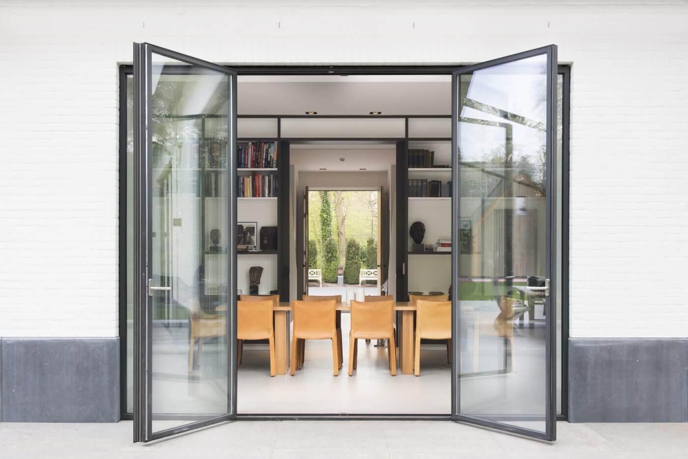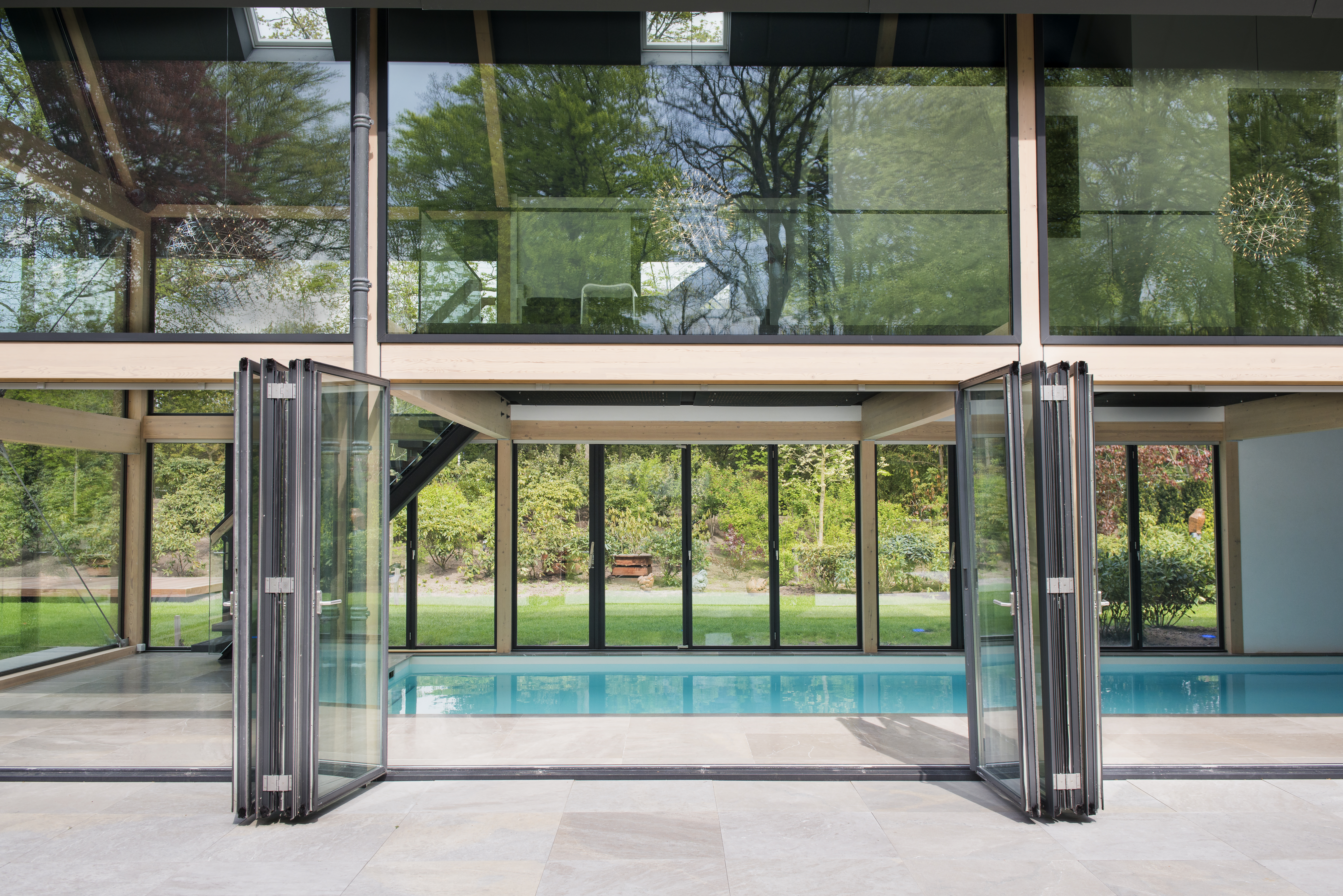 Van de manshoge dakkapellen in de kruin tot de openslaande deuren op de begane grond en de grote vouwdeuren bij het zwembad: licht en zicht is het devies. De glazen deuren aan de tuinzijde werden bijvoorbeeld met opzet twee keer zo breed gemaakt. “Dit zorgt voor veel licht in de kamers en een fraai uitzicht op de tuin.” Alle ramen, taatsdeuren, stolpdeuren en vouwdeuren zijn op maat gemaakt door Metaglas. Poort viel daarbij vooral voor de slanke profilering van het product. “Dat maakt dat het geheel er heel strak uitziet. Het benadrukt het contrast tussen modern en klassiek, en juist dat contrast zorgt ervoor dat alles bij elkaar past.”