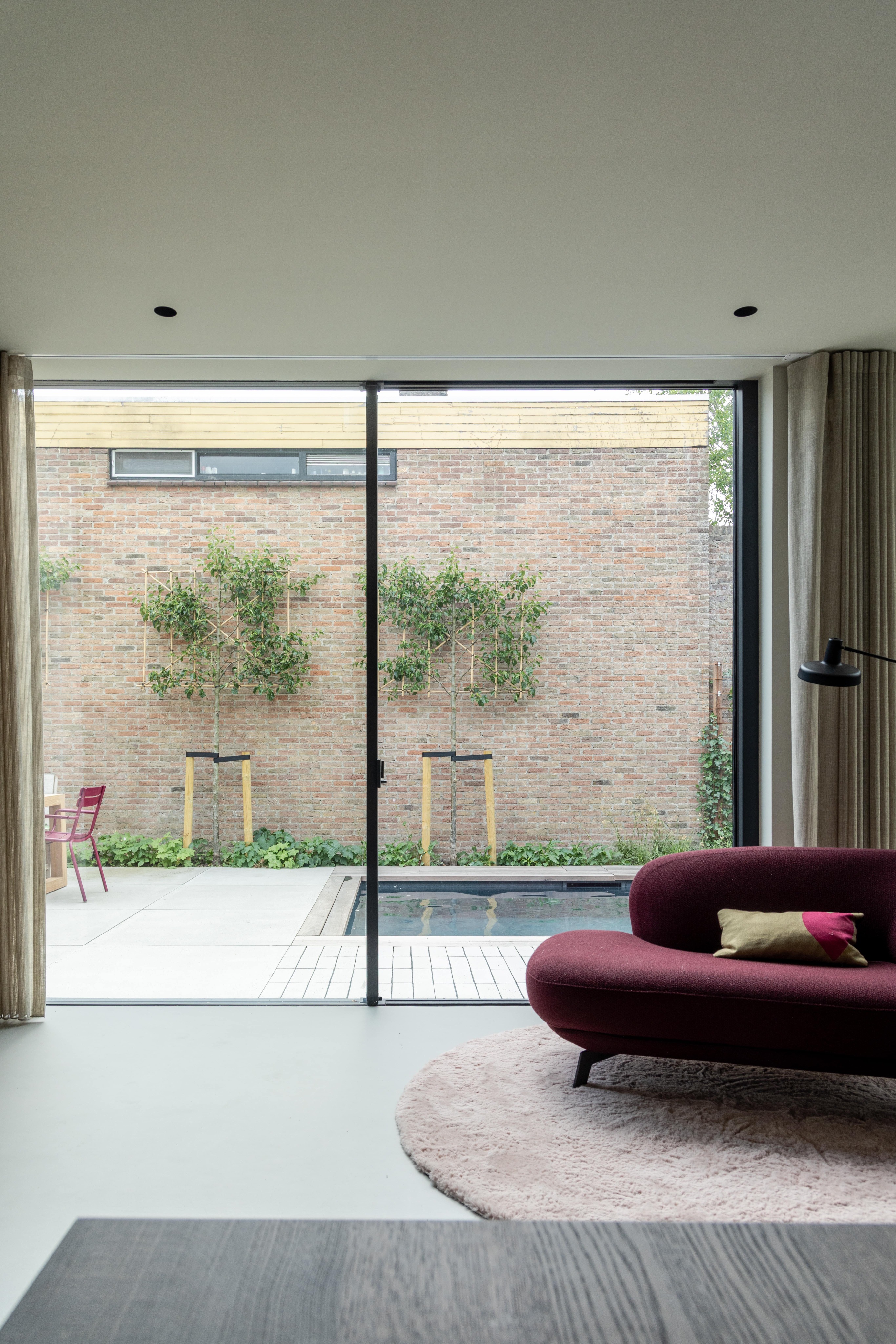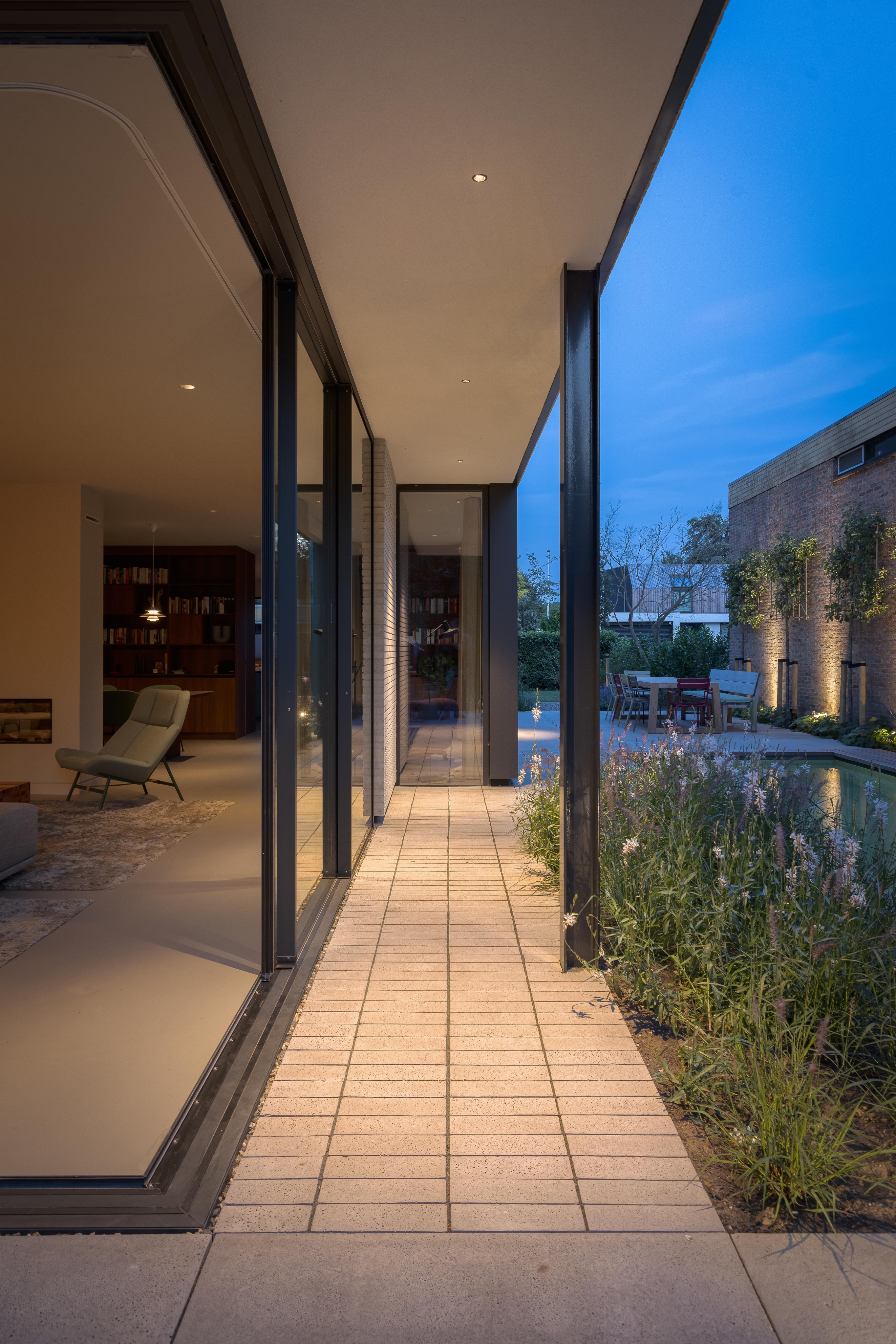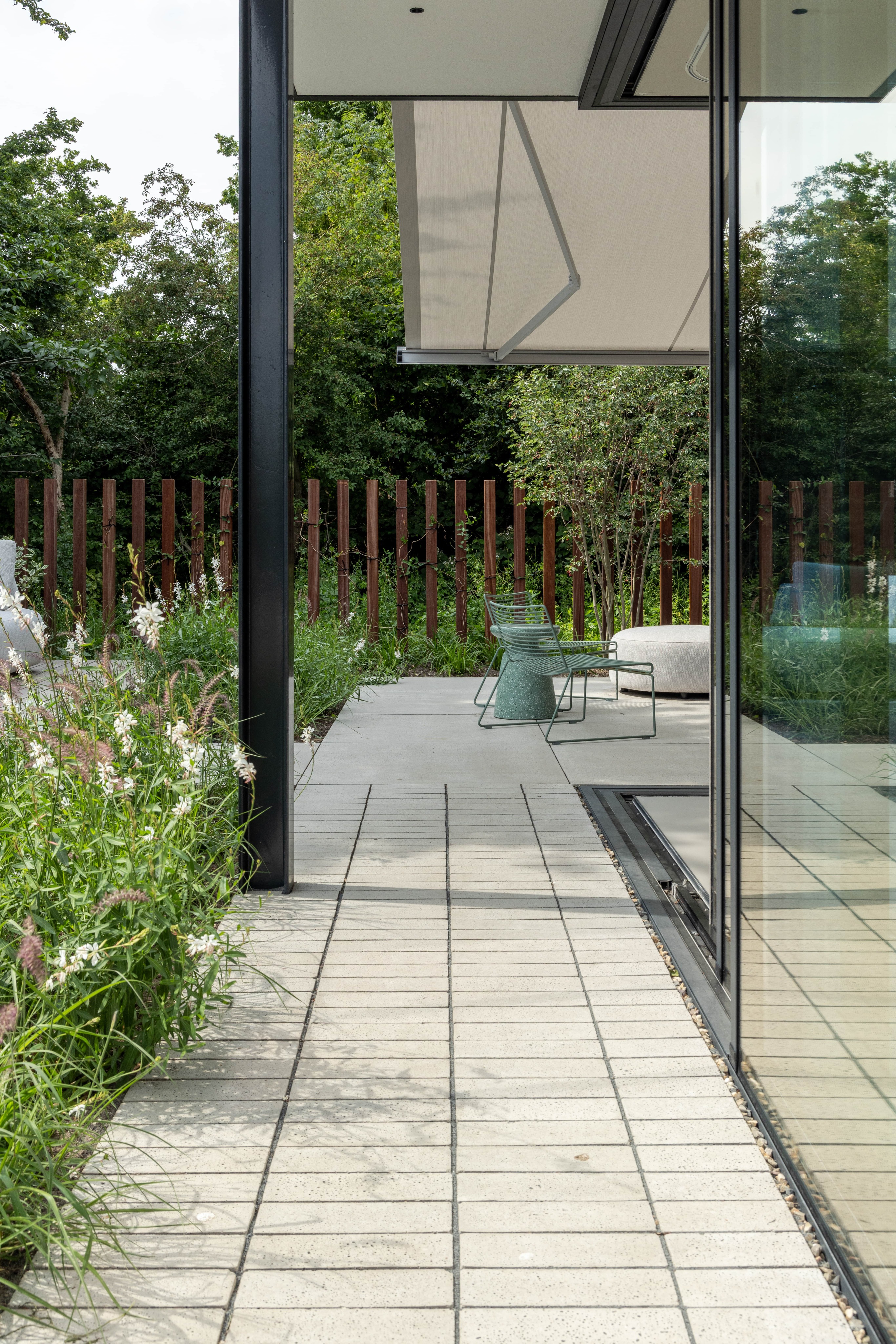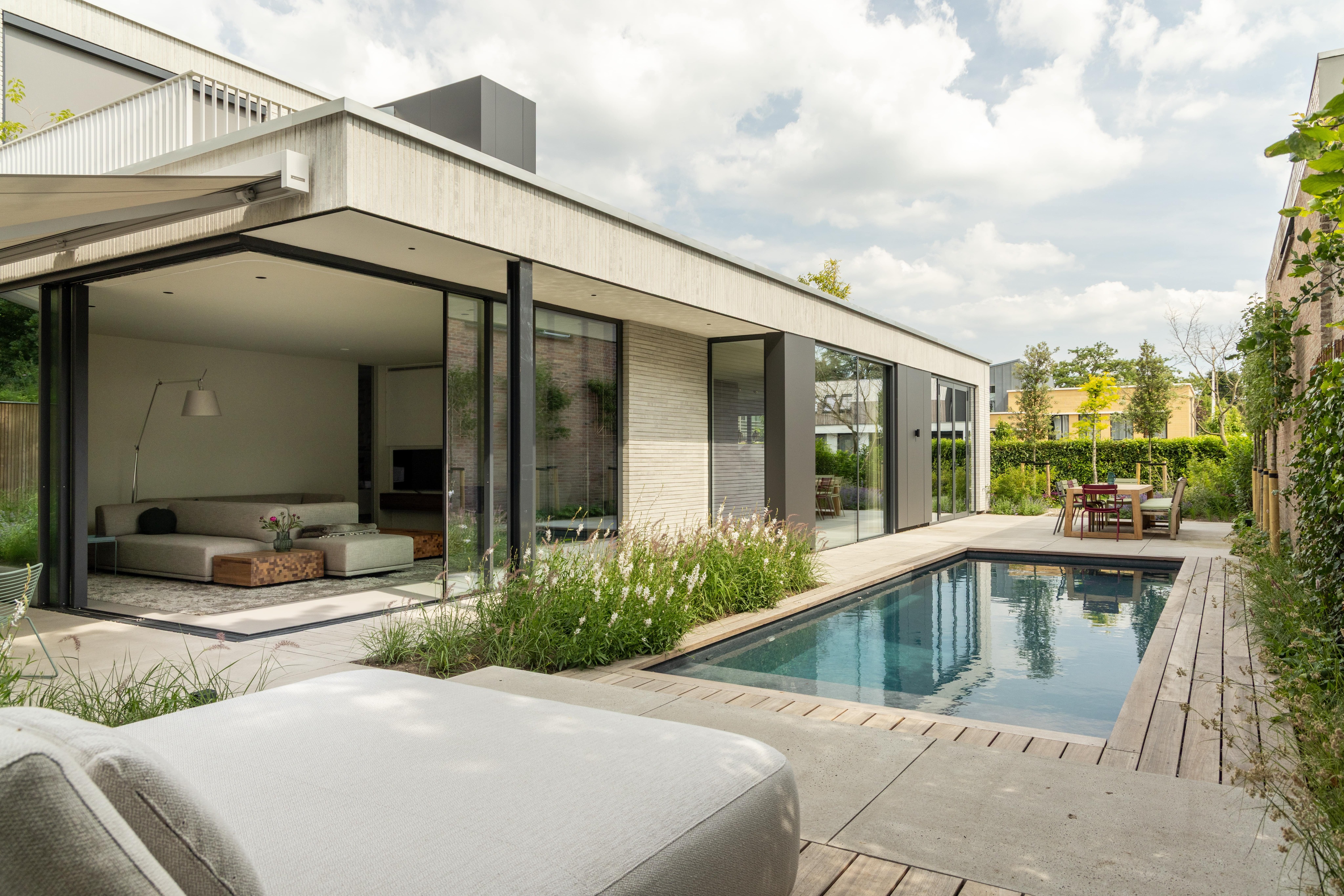 Ook in de tuin speelt transparantie een hoofdrol. Een ingetogen zwembad omringd door groen en houten vlonders van padoek vormt een rustige blikvanger. Dankzij de slimme plaatsing en het gebruik van duurzame materialen blijft het ontwerp stijlvol en functioneel. In combinatie met de glazen puien ontstaat er een dynamische woonomgeving waarin jaarrond genoten wordt van licht ruimte en natuur.
