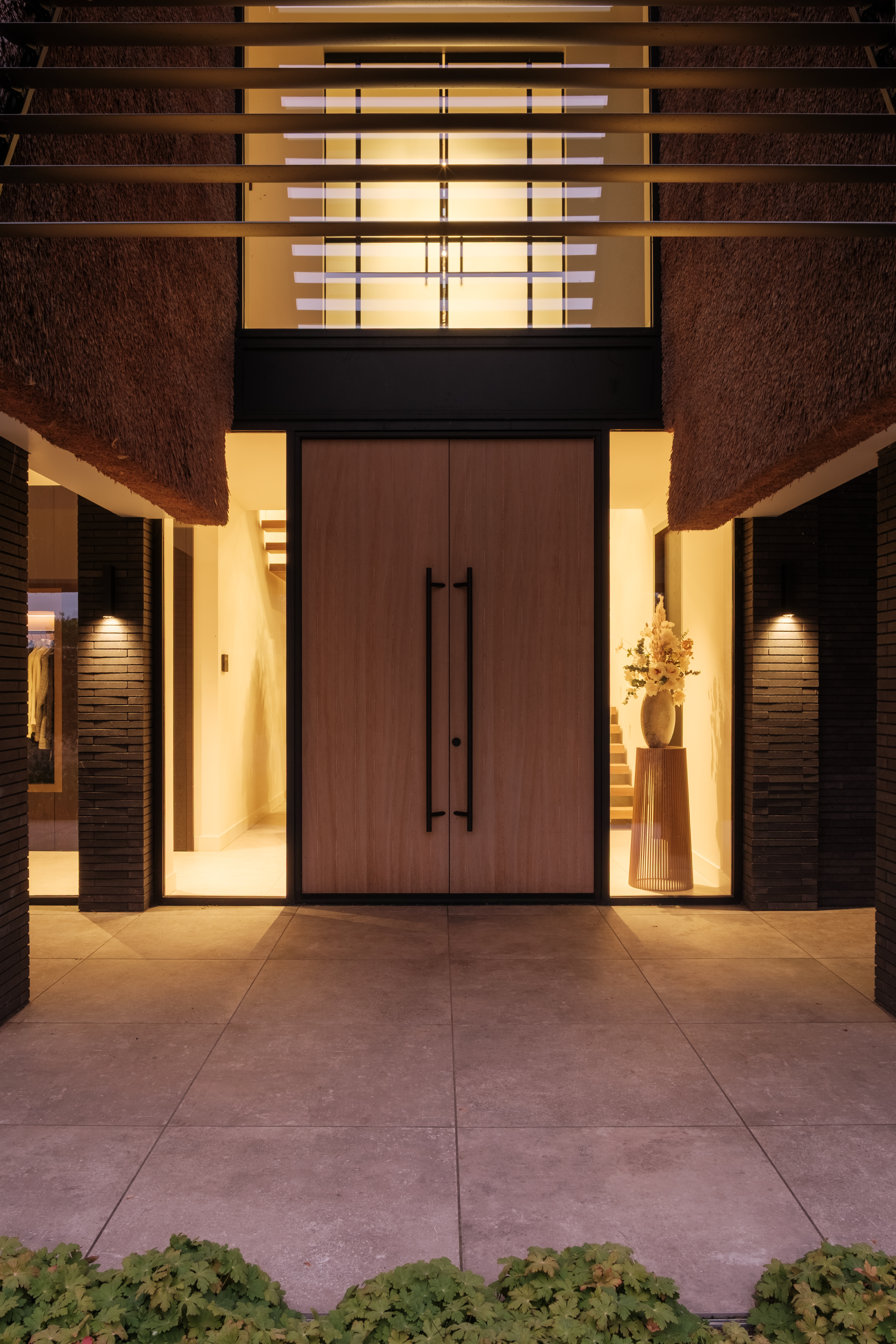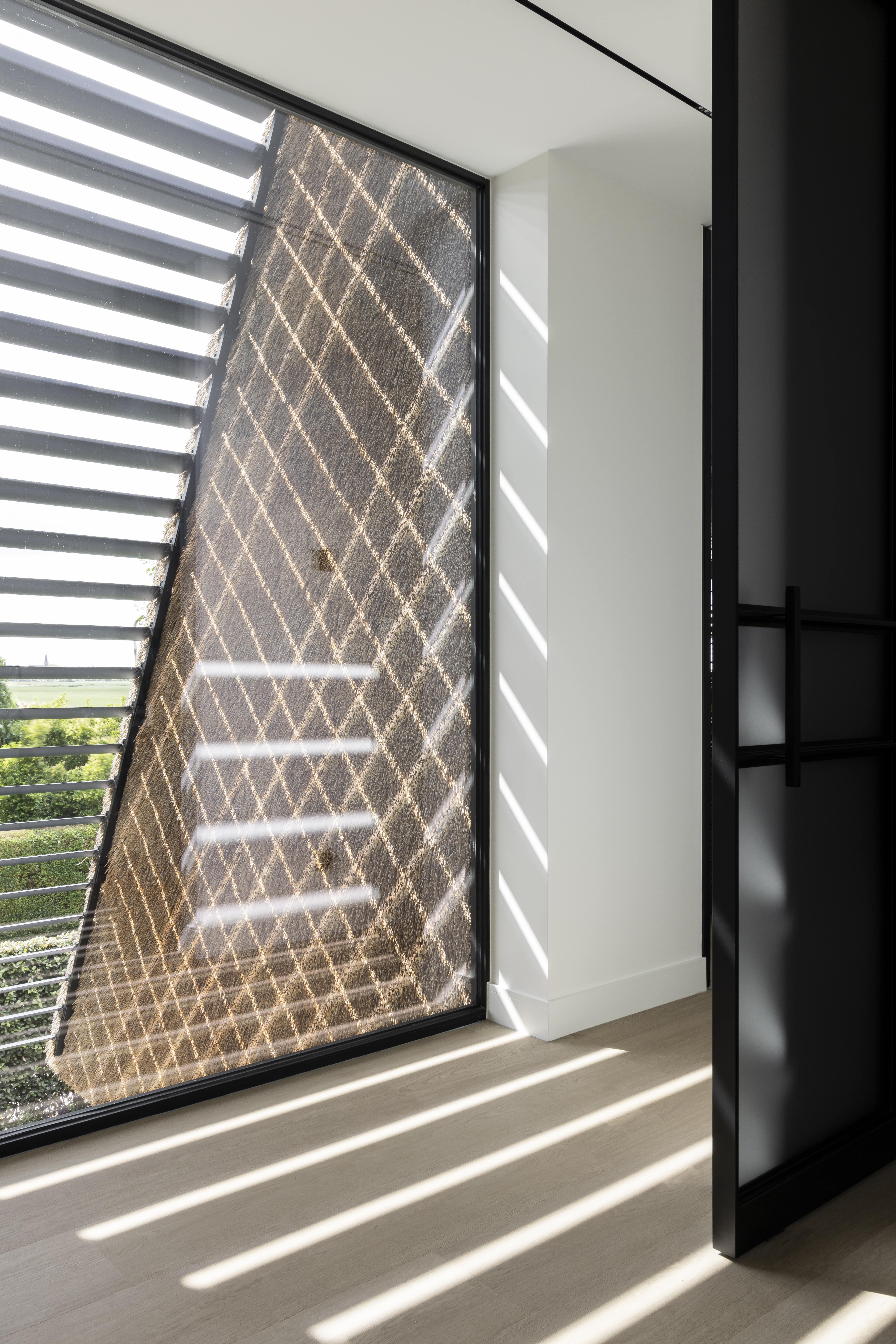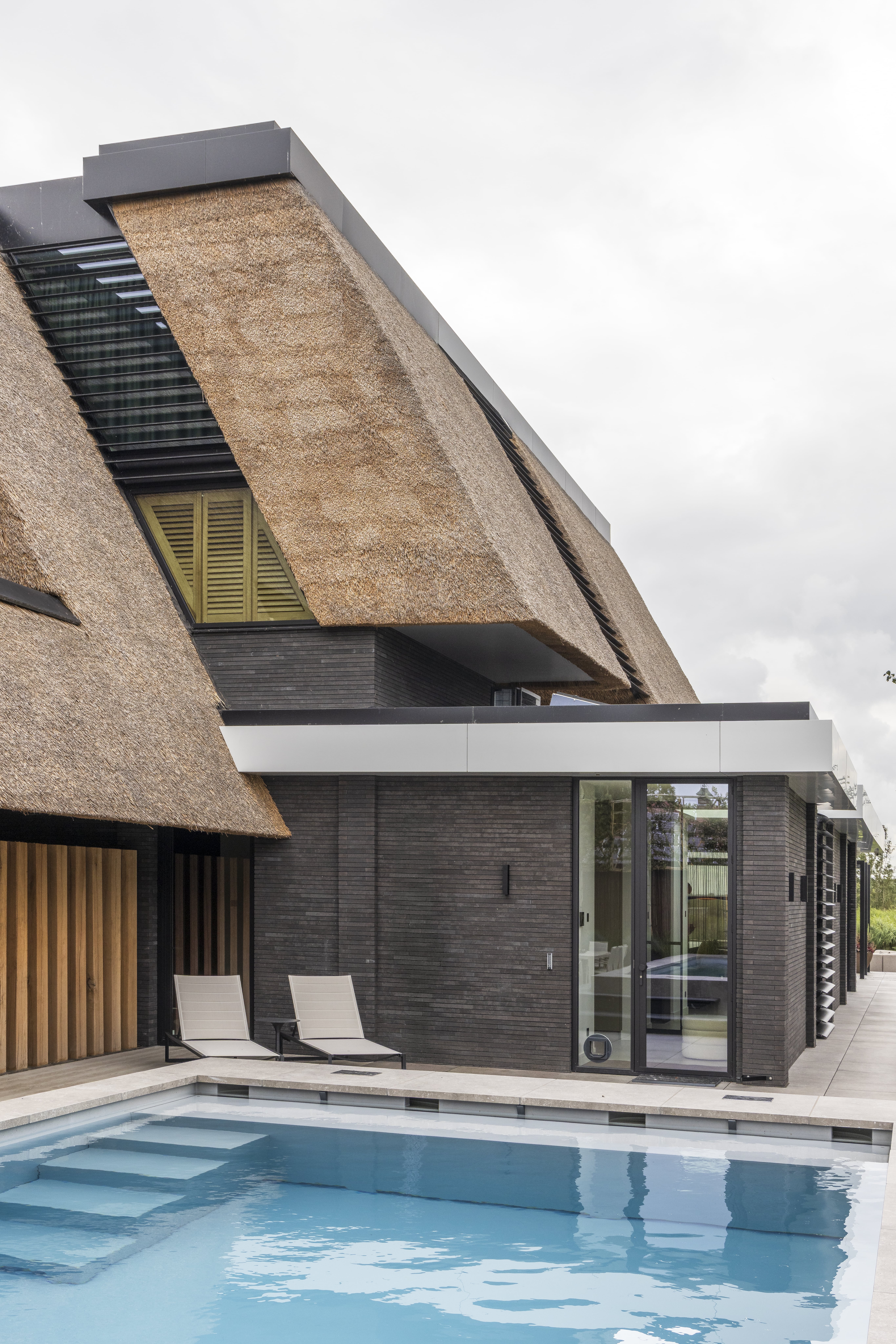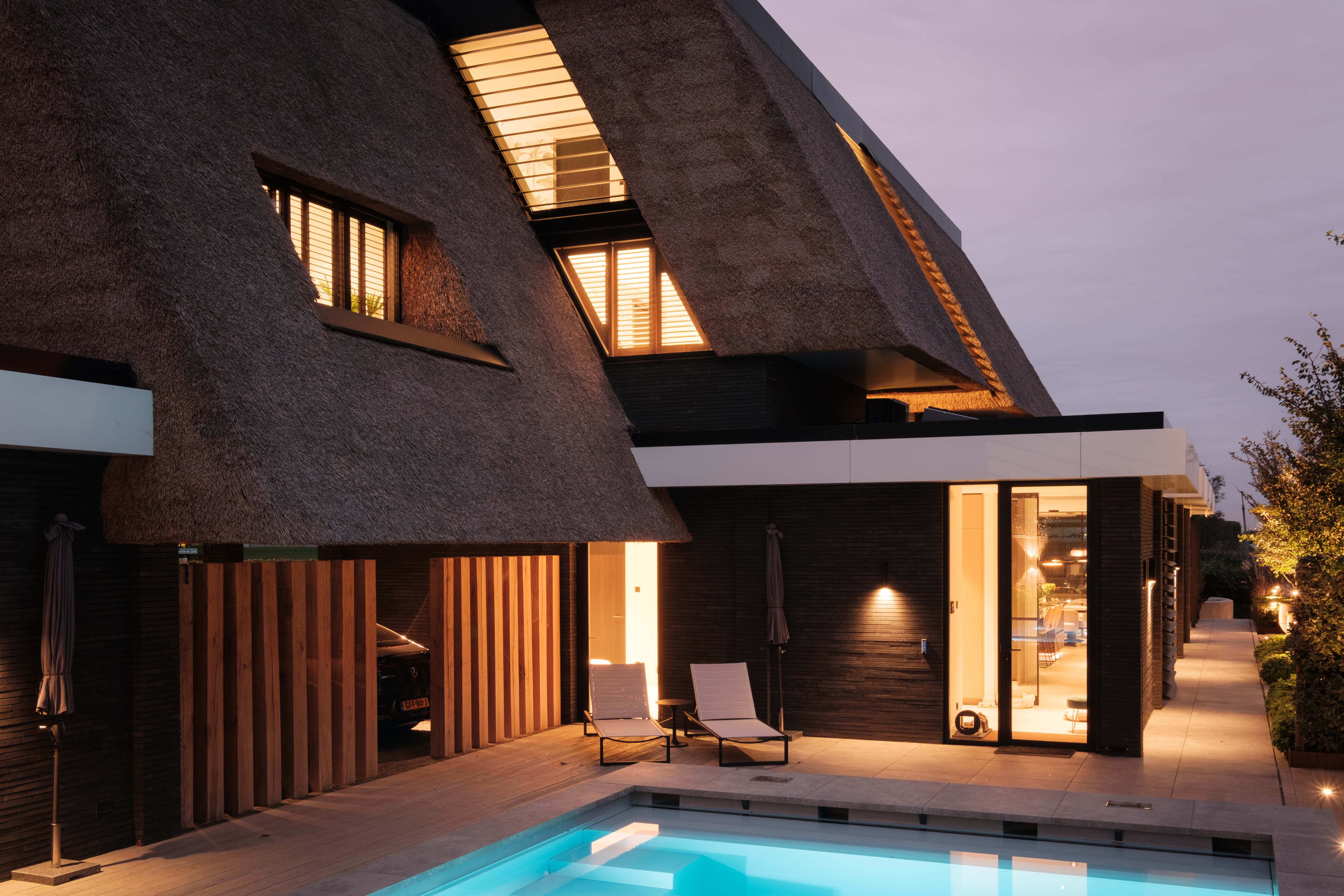 De rieten kap is geen traditioneel gebaar, maar een eigentijds element dat de villa haar karakter geeft. De ramen liggen verdiept in het volume en worden door riet omlijst, waardoor licht zich gefilterd een weg naar binnen baant. Zonwerende lamellen creëren een spel van lijnen dat over vloeren en wanden beweegt, terwijl grote glasvlakken het interieur verbinden met het landschap: water, lucht en riet komen samen in één rustig panorama.