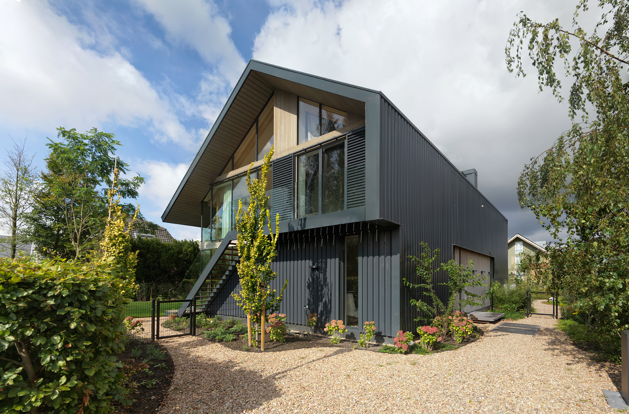 Om werk- en privéleven gescheiden te houden kreeg het atelier wel een eigen opgang aan de buitenzijde van het huis, maar deze is zo natuurlijk ingepast dat het gevelbeeld erdoor wordt versterkt. “De buitentrap gaat naadloos over in de dakrand. Dat maakt deze woning uniek.” Bovendien vormt de buitentrap een mooie overgang tussen de straat- en tuinzijde. “Villa Sion heeft twee gezichten”, legt Alewijnse uit. “Aan de entreezijde is de gevel bijna volledig gesloten en omwikkeld met een zwarte gevouwen staalwand voorzien van een stoer reliëf, vergelijkbaar met een damwandprofiel. Door aan deze kant de privacy te waarborgen konden we de woning aan de rand van het kavel plaatsen en bleef er veel tuin over.”