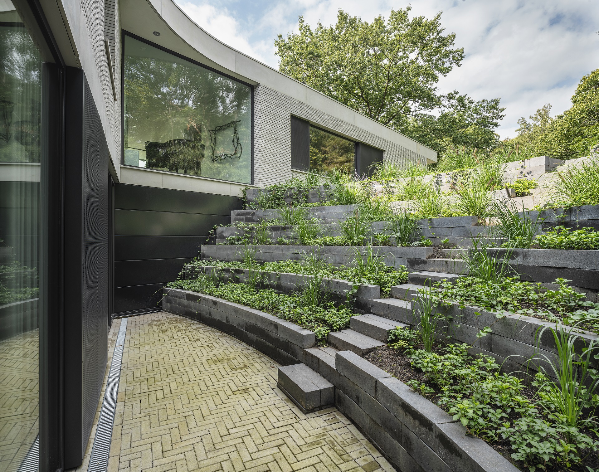 De passies van de opdrachtgevers komen in de nieuwe woning volledig tot hun recht. Lange, speciaal uitgelichte wanden bieden door het hele huis ruimte voor schilderijen. Dujardin: ‘Het huis moest zelf ook kunst zijn. Dat zie je aan de afwerking, de detaillering, de kleuren… ja zelfs aan het bureau in de werkkamer. Die hebben wij ontworpen in exact dezelfde vorm als het dak van het huis. En de sculpturale trap naar het souterrain is ook een kunstwerk op zich. Wanneer je deze afdaalt, kom je op een verzonken verdieping waar zich ook de garage en gastenkamers bevinden. Vanaf hier heb je zicht op een getrapt vormgegeven landschap die de relatie tussen binnen en buiten versterkt. Techniek en natuur werken samen zodat je op elke plek in het huis de omgeving ervaart en kunt genieten van de seizoenen.”