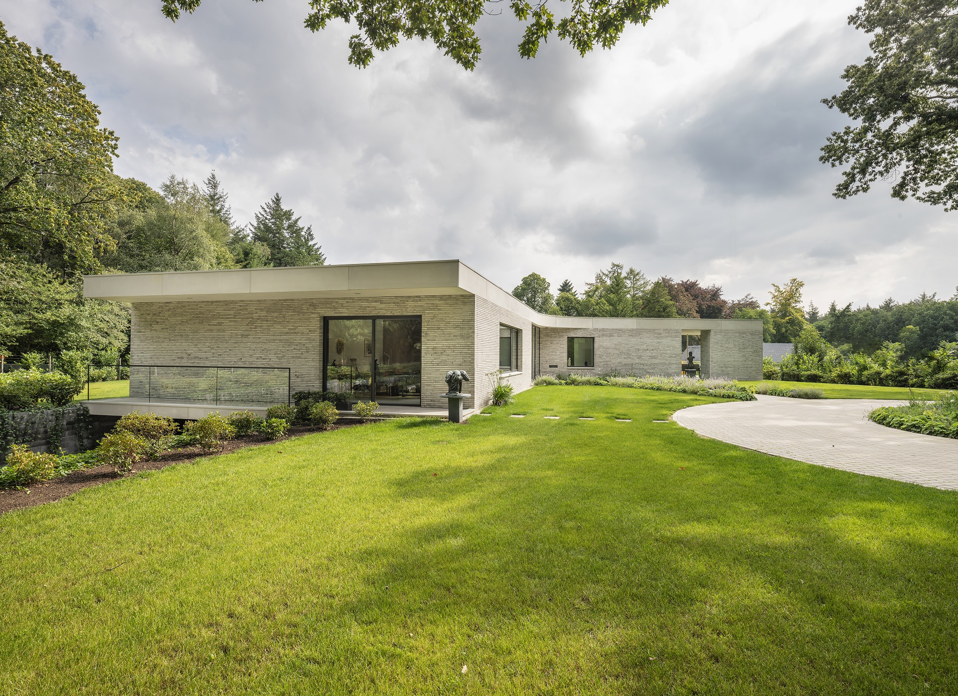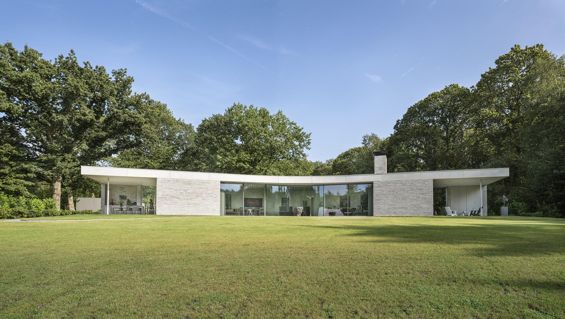 De villa ligt middenin de bossen op een uitgestrekt kavel en biedt vanuit de woonruimte vrij uitzicht over een licht glooiende weide aan de zuidkant. De verdiepingshoge en gebogen glazen gevel loopt perfect mee met de ronding van het huis en zorgt zo voor de verbinding tussen binnen en buiten. Dujardin: ‘We hebben in het ontwerp de juiste balans gezocht tussen openheid en geslotenheid. Zo verbindt de transparante entree in het hart van de villa de meer private noordvleugel met de verschillende leefruimten in de twee zuidelijke vleugels, die elk hun eigen sfeer hebben.”