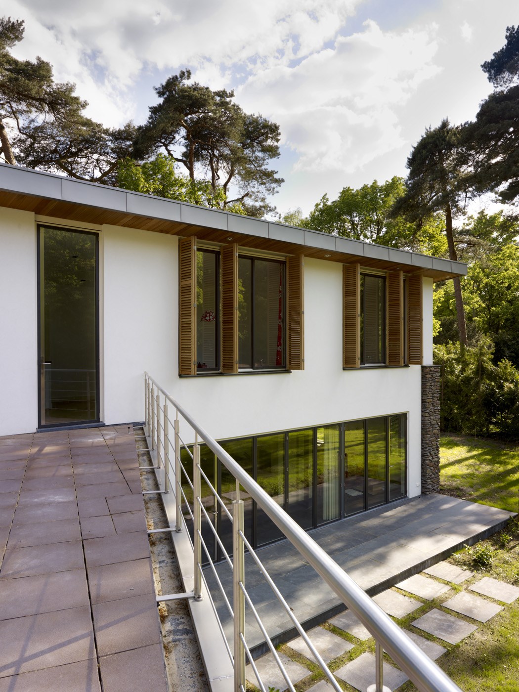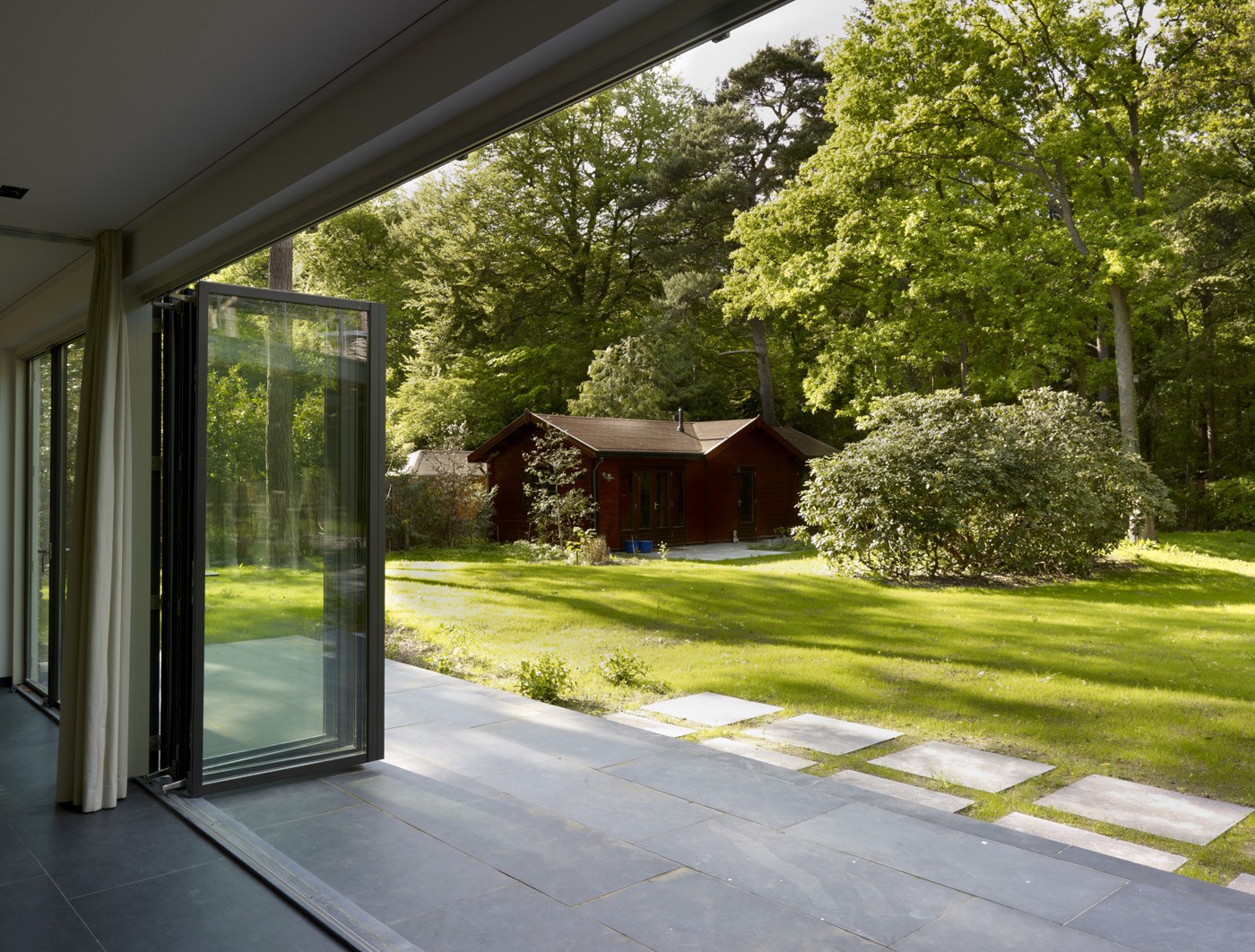 Heijmerink heeft in het paviljoen gestreefd naar een heldere, even natuurlijke ambiance. ‘Het wordt gedomineerd door een grote loungeruimte. De slanke profielen van de glazen schuifpuien gaan schuil achter de gevel, zodat alleen het glas – en daardoorheen het bos – te zien is. Het lichte stucwerk met enkele gekleurde accenten, de eikenhouten spiraaltrap en de leistenen vloer dragen heel genuanceerd bij aan de natuurlijke sfeer.’ De architect is trots op het resultaat – en vooral dat het naadloos aansluit op de woonwensen van de opdrachtgevers.