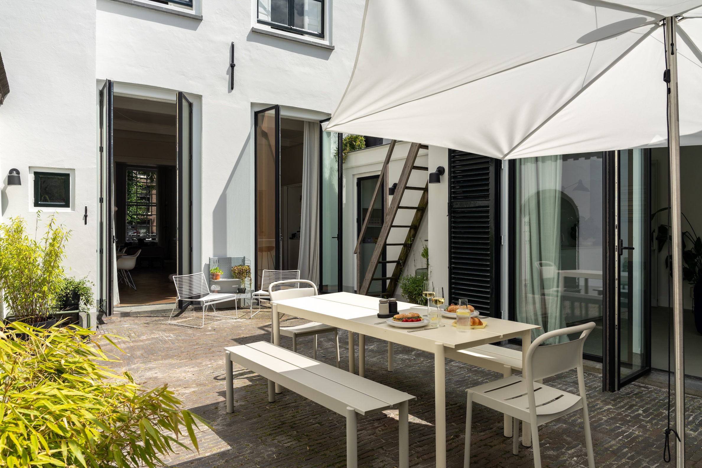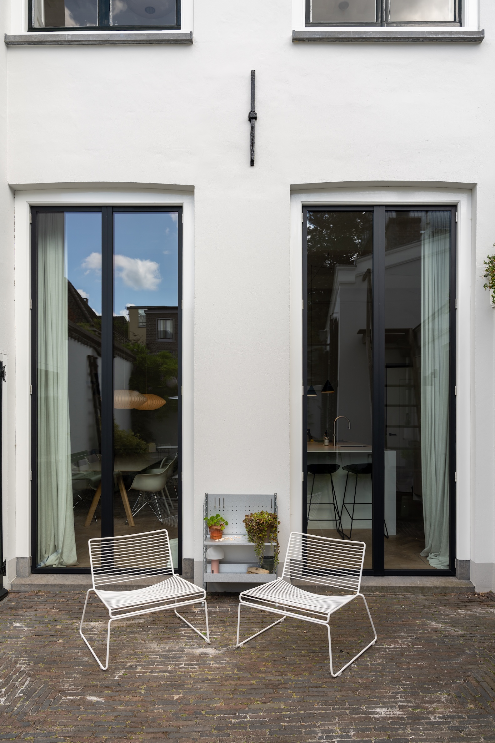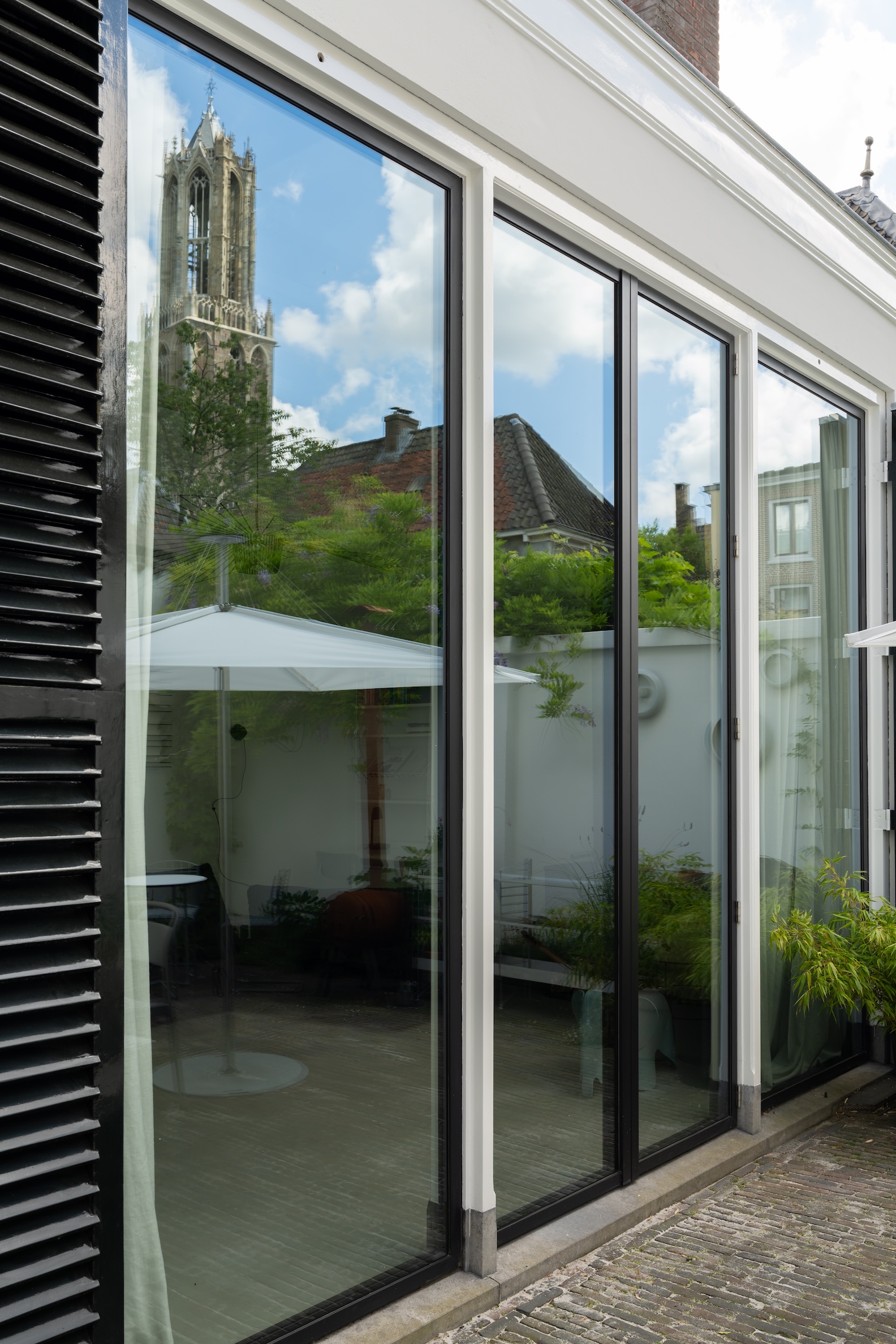 De openslaande deuren naar de tuin zorgen voor een directe verbinding tussen binnen en buiten. Tegelijkertijd blijft het oorspronkelijke gevelbeeld behouden. Ideaal voor een monumentale omgeving waar stijl en sfeer centraal staan maar waar ook comfort en duurzaamheid gewenst zijn.