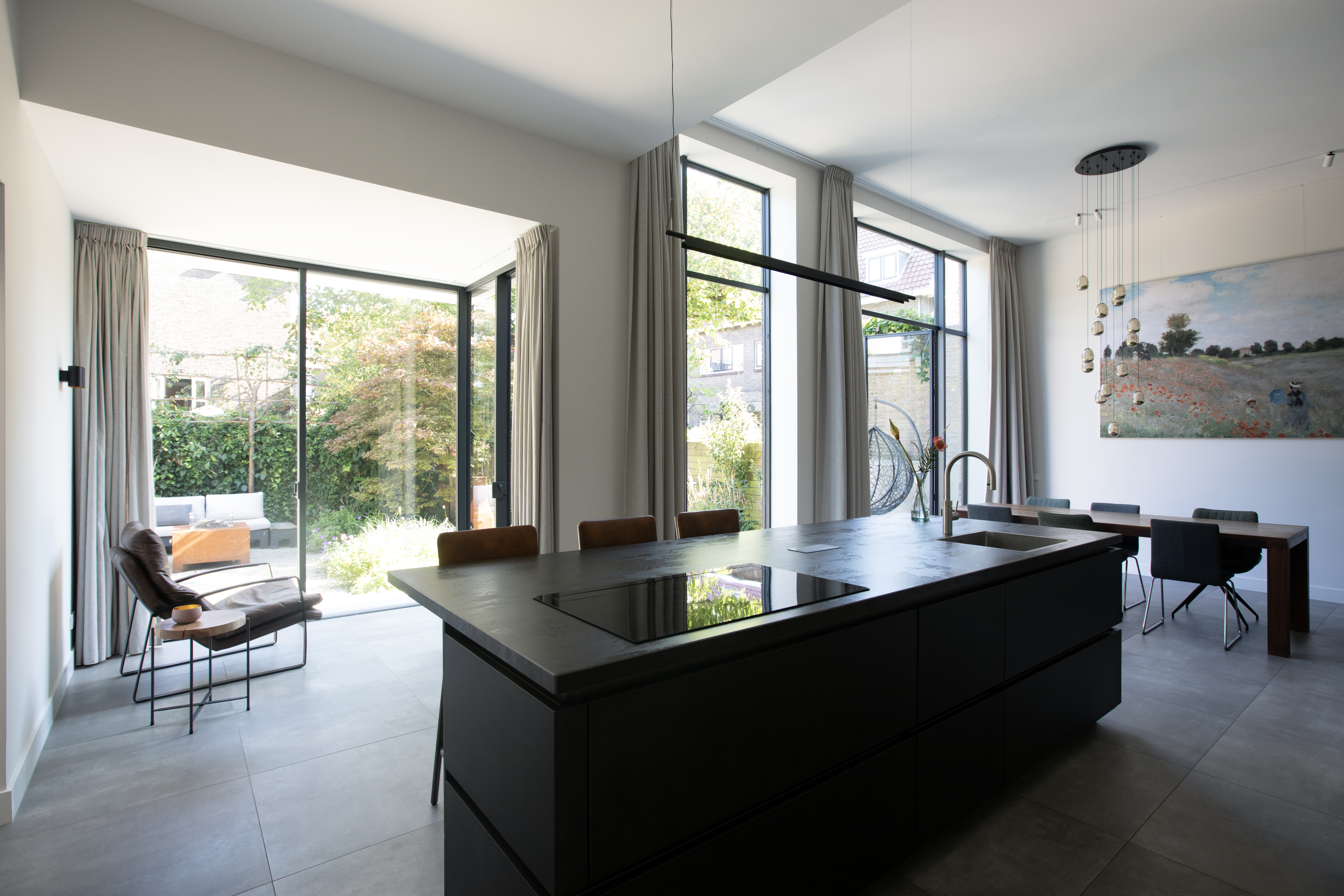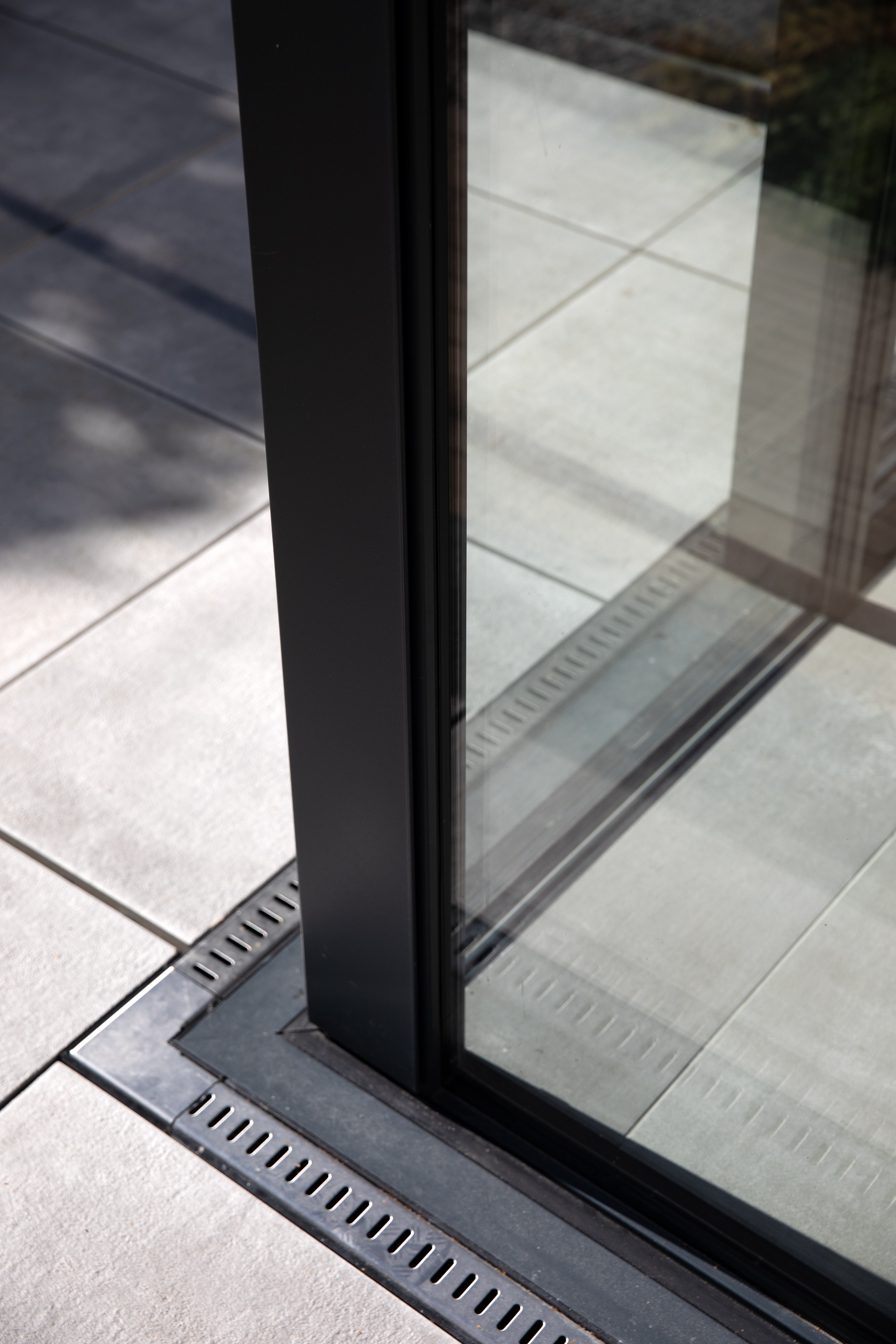 Er is extra aandacht besteedt aan de aansluiting van de woonkeuken met het terras. De onderdorpel van de schuifpui is weggewerkt in de vloer zodat de vloer van de keuken overloopt in het terras buiten. Hierin is ook de afwatering opgenomen.