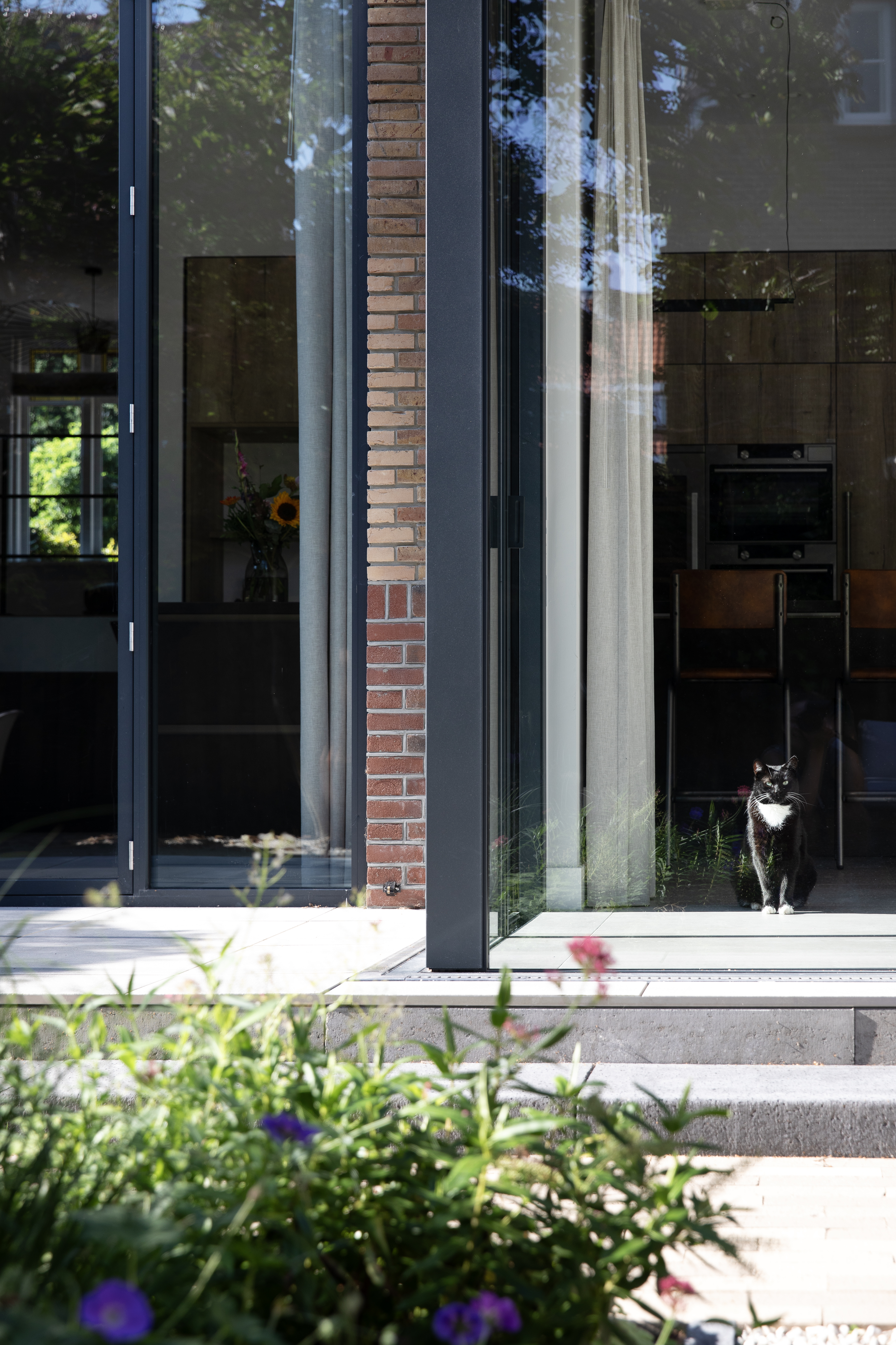 Om extra daglicht en ruimte te creëren steekt de uitbouw verder door dan de originele achtergevel. De uitbouw is uitgevoerd in lange, smalle stenen in Hilversum formaat die qua kleur aansluiten bij de plint van de woning. Om van de achtergevel en de uitbouw één geheel te maken, loopt het lijnenspel in de aluminium pui over de breedte door.