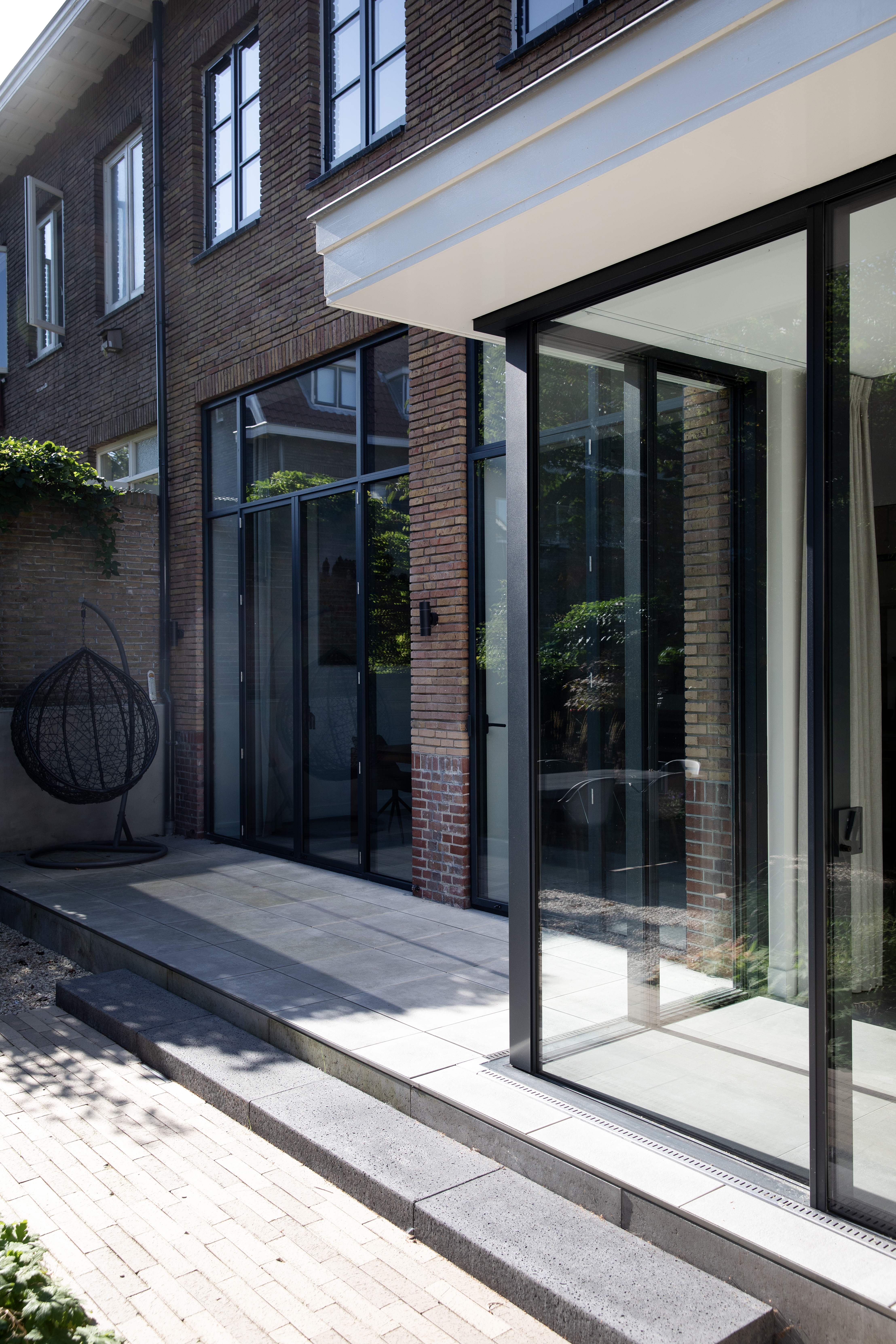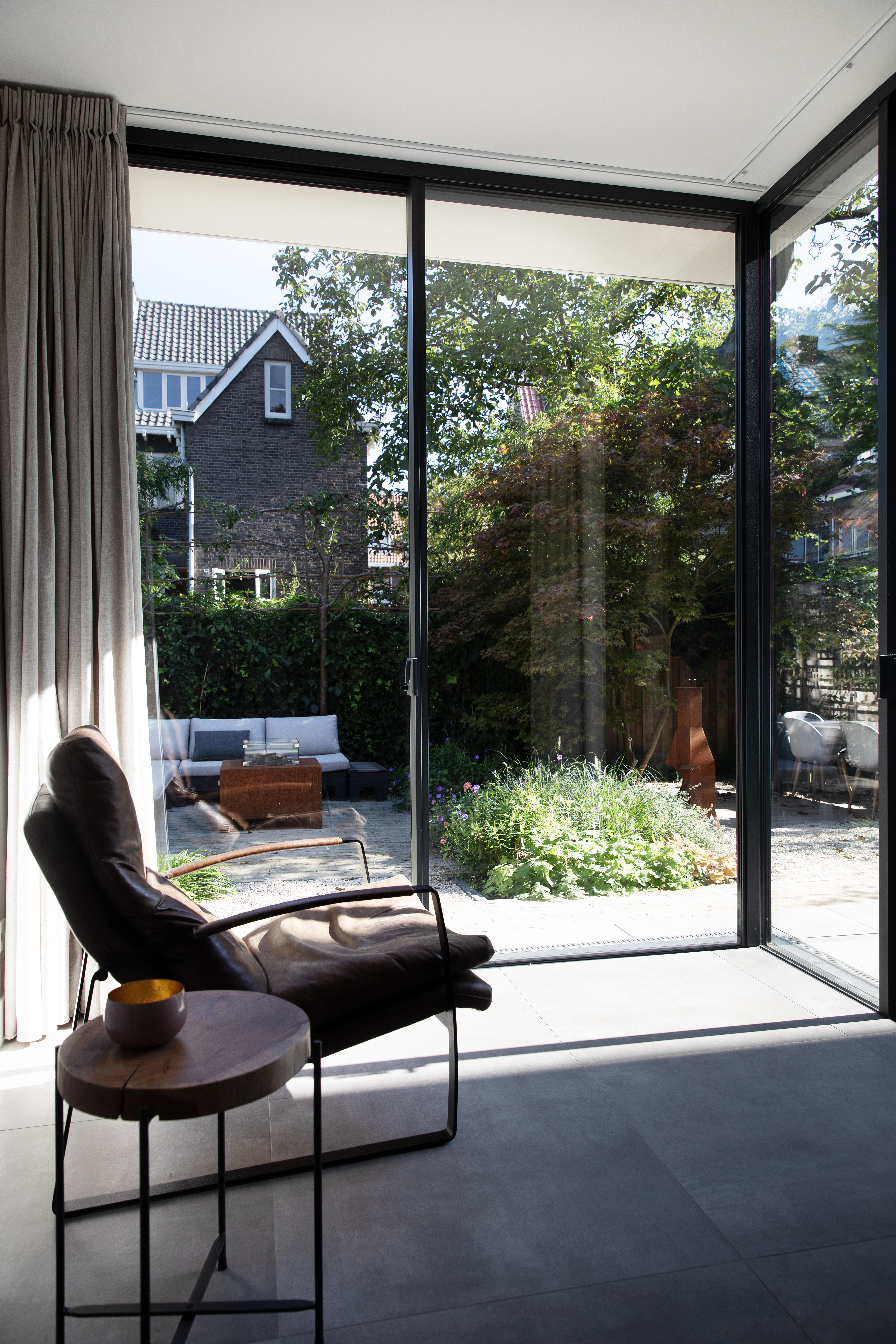 Een sterke connectie met de buitenwereld, was een van de uitgangspunten in dit ontwerp. Het toegepaste openhoek schuifsysteem zorgt in gesloten toestand voor maximale daglichttoetreding met zo min mogelijk onderbrekingen en in open toestand voor een drempelloze verbinding met de buitenomgeving.