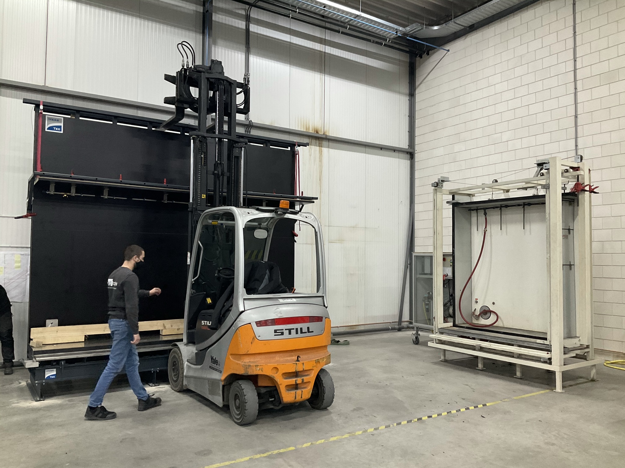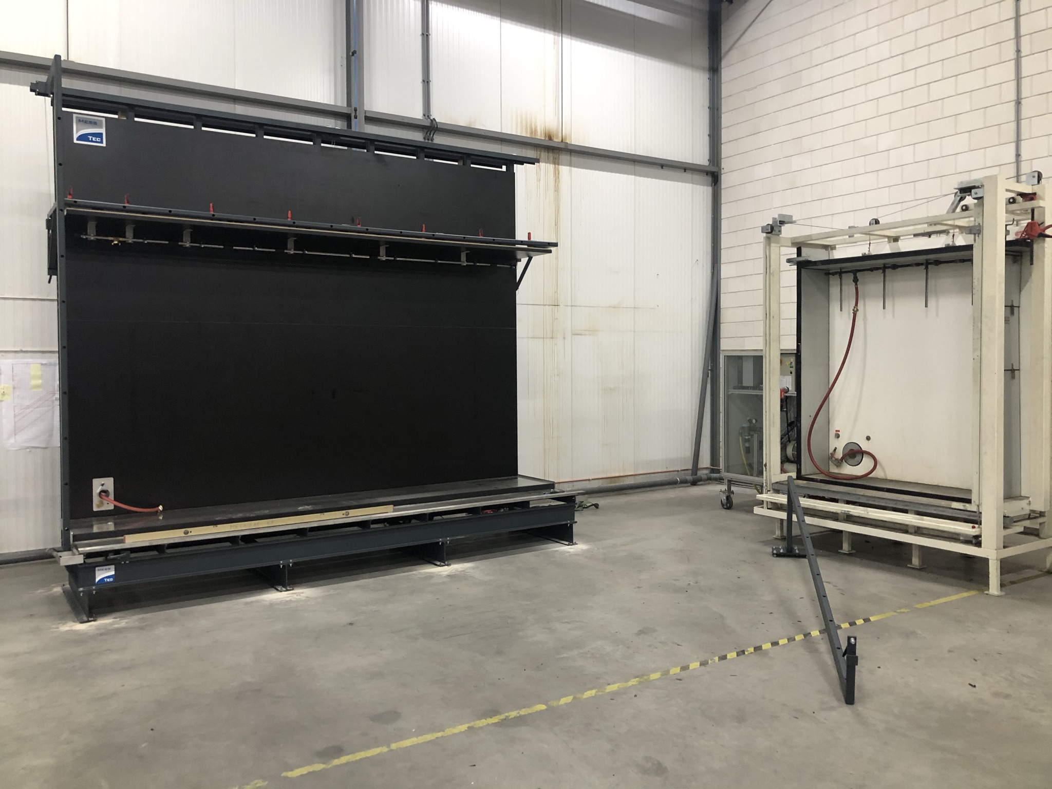 Dat hele grote ramen weer in de mode zijn is natuurlijk gunstig voor een bedrijf zoals Metaglas. Al betekent dit wel dat er investeringen gemaakt moeten worden in bijvoorbeeld de testapparatuur. Vandaar dat er afgelopen week een nieuwe testkast is binnengekomen, waarmee veel grotere ramen getest kunnen worden op wind- en waterdichtheid. Hierboven een foto van de oude testkast (rechts) en de nieuwe testkast (links) die nog wordt opgebouwd.