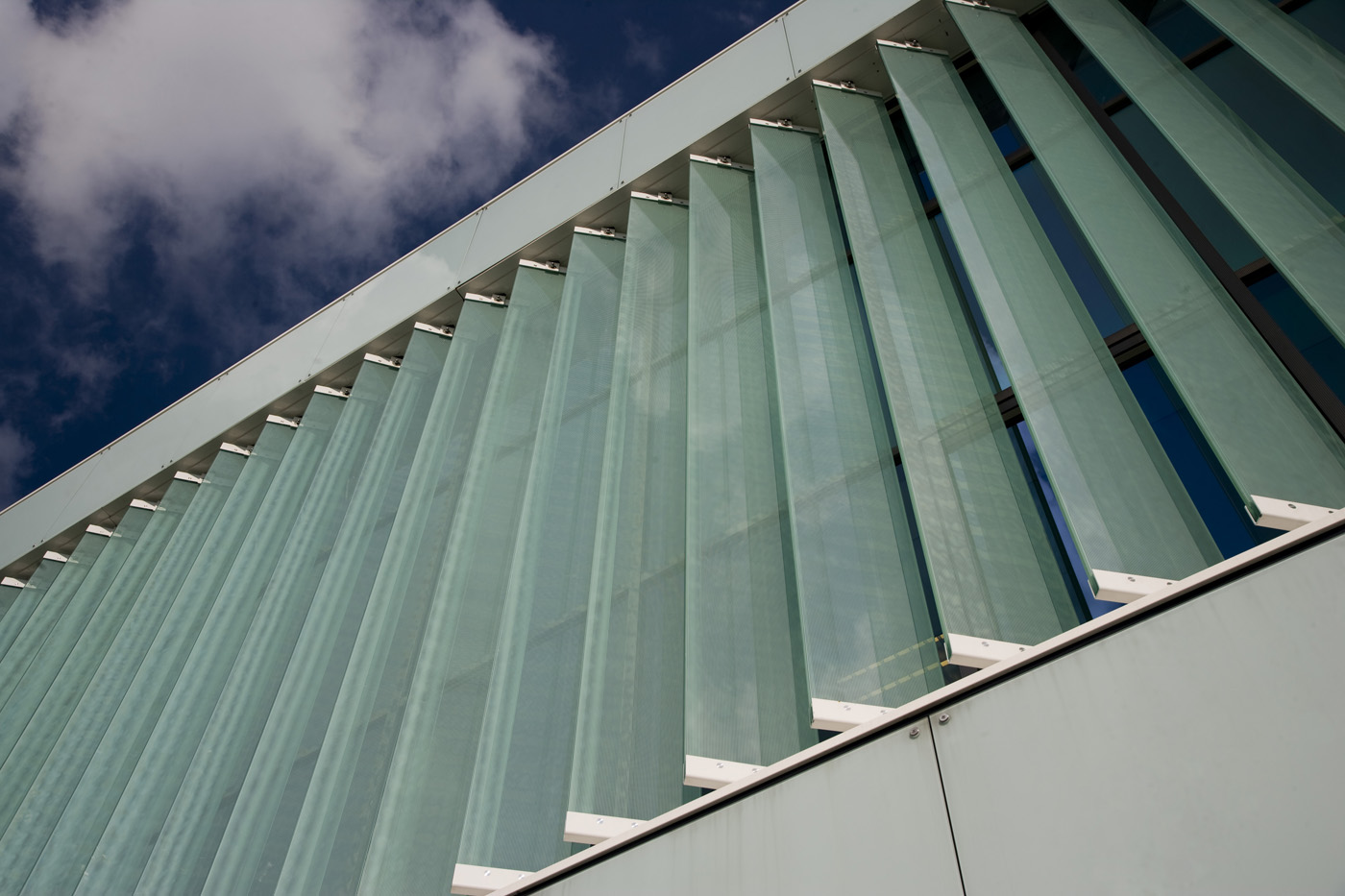 Total Glas lamellen kunnen ook elektrisch worden bediend. De slanke glazen panelen kunnen meerdere verdiepingen overspannen en zijn bevestigd aan een strak vormgegeven stalen draaimechanisme. Door gebruik van bedrukte folies kunnen deze lamellen worden toegepast als zonwering. Het gekozen patroon van de folie bepaalt de mate van lichttoetreding in gesloten stand. Dit zorgt voor een bijzondere en levendige gevel die niet alleen het binnencomfort en het energieverbruik reguleert, maar daarnaast ook een architectonisch fraaie uitstraling heeft.