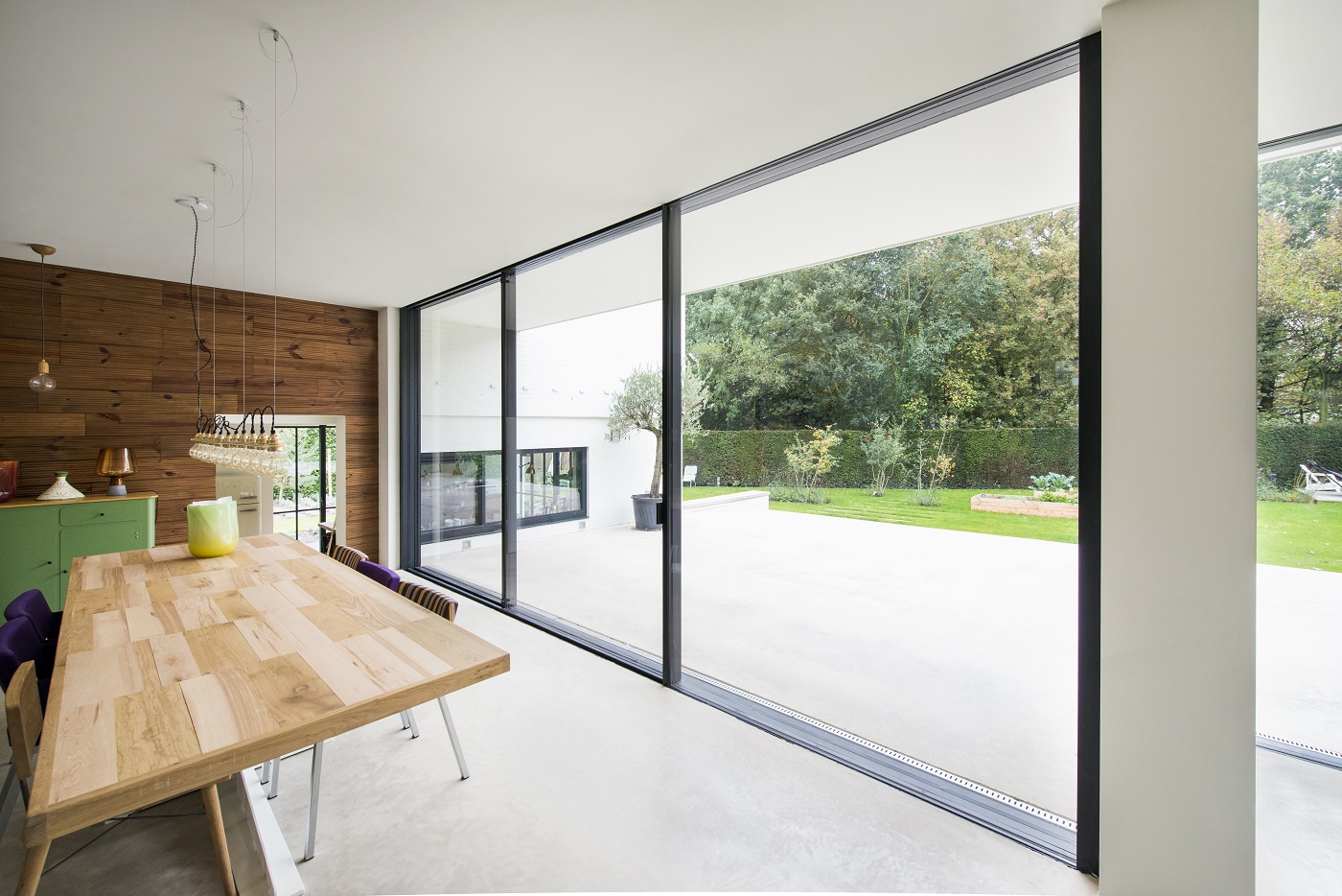 Het driedelige horizontale schuifraam van Metaglas bestaat uit twee schuivende glaspanelen en één vast paneel. Hierbij kunnen de glaspanelen voor het vaste paneel worden geschoven waarmee er een opening van 66% gerealiseerd wordt. Dit in tegenstelling tot de standaard schuifpuien die voor 50% geopend kunnen worden. Het minimale design en grote glasoppervlakken zorgen voor ultiem contact tussen binnen en buiten. Wanneer de profielen in de wanden, vloer en plafonds worden verwerkt, wordt de beleving nog meer versterkt.