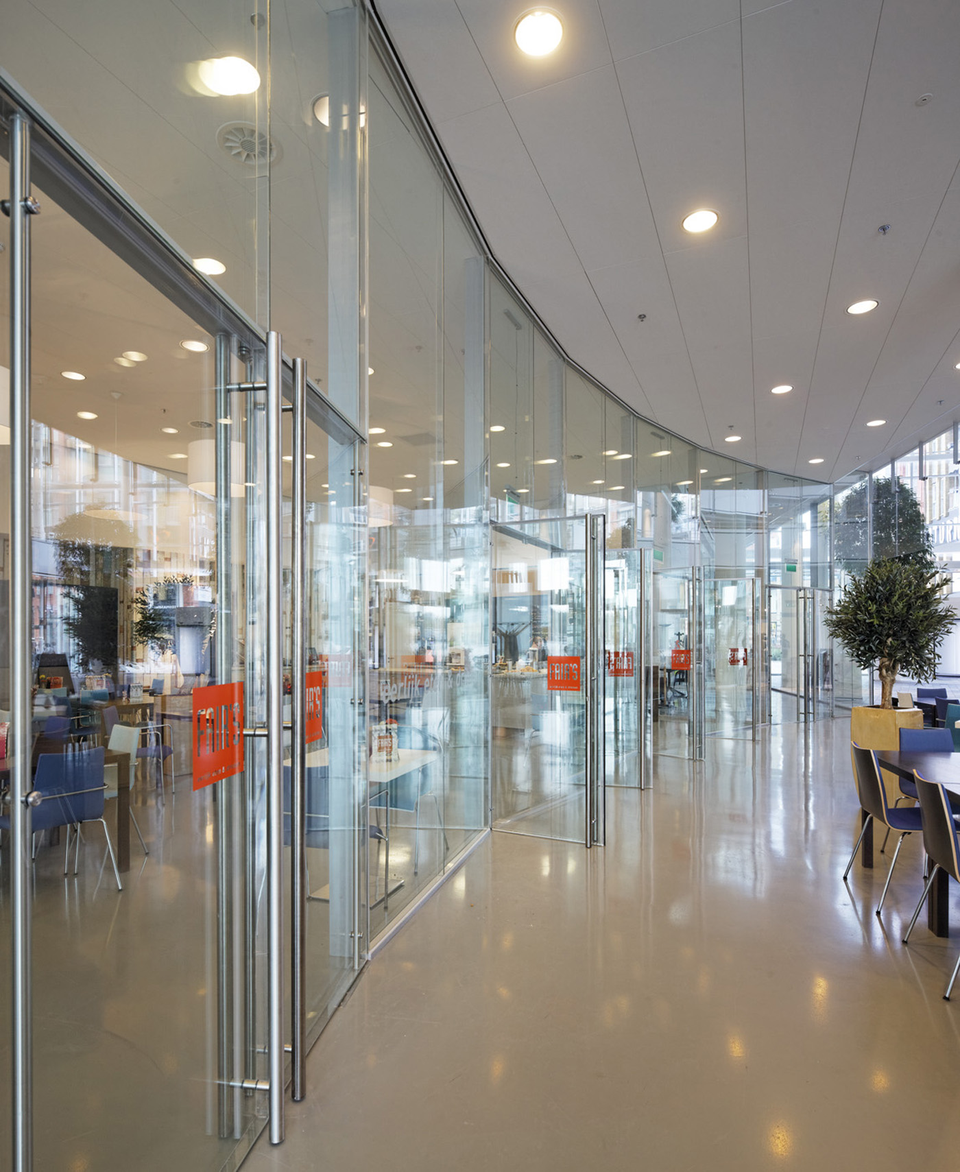 Metaglas plaatste een bijna dertig meter lange geluiddwerende glazen wand in dit project. Deze uitzonderlijke hoge wand (4400-4750 mm) scheidt het atrium van verschillende andere ruimtes zoals een lunchroom en de Burgerzaal (trouwzaal). Gezien de bedrijvigheid in de hal was optimale geluidwering een voorwaarde, terwijl er wel openslaande deuren in de wand moesten komen. De volledig glazen wand met glazen deuren van Metaglas zorgt ervoor dat het daglicht onbelemmerd binnen kan stromen en dat geluid geweerd wordt tot maar liefst 45 dB.